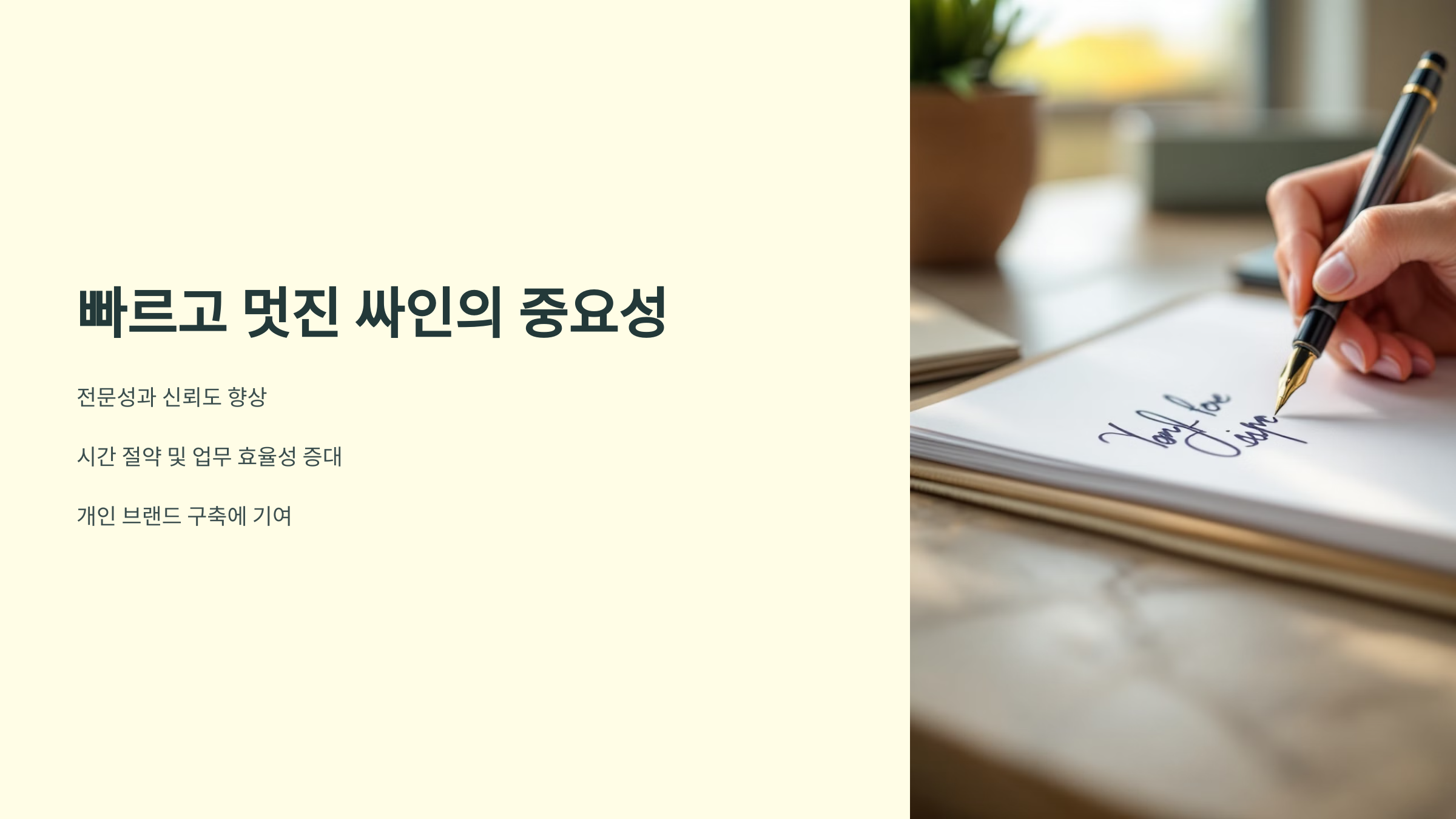 빠르고 멋진 싸인은 개인 브랜딩, 신뢰감, 효율성을 높이는 역할을 해요. 특히 비즈니스, 계약서, 서류 작성에서 너무 오래 걸리거나 흐트러진 싸인은 비효율적이죠. 🖋️