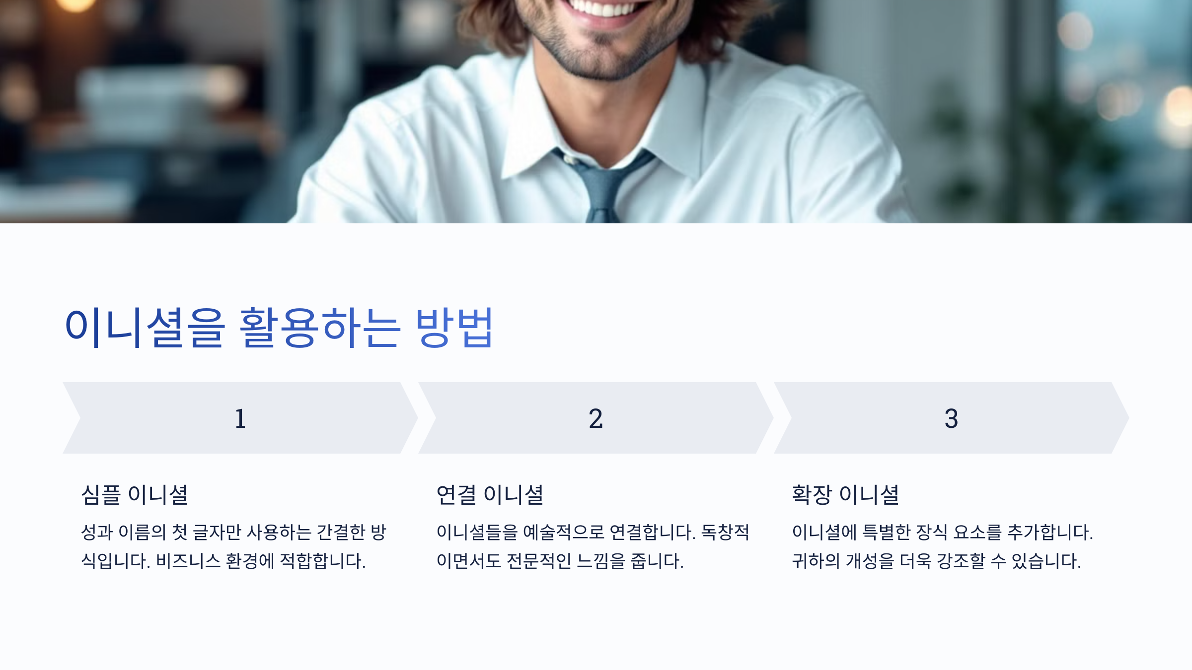 1. 독특한 시작 또는 끝 이니셜이나 이름의 첫 글자에 강한 강조를 주거나, 끝에 독특한 마무리 추가 "J. Kim ↘" / "H. Park ⭐"