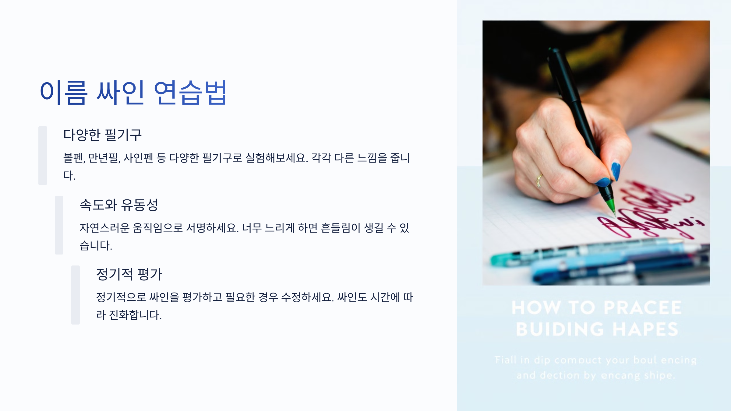 A7. 하루 5분씩 짧게라도 꾸준히 연습하는 것이 효과적이에요. 또한, 싸인을 녹화하거나 다양한 필기구로 연습하면 스타일을 더 빨리 확립할 수 있어요. 🚀