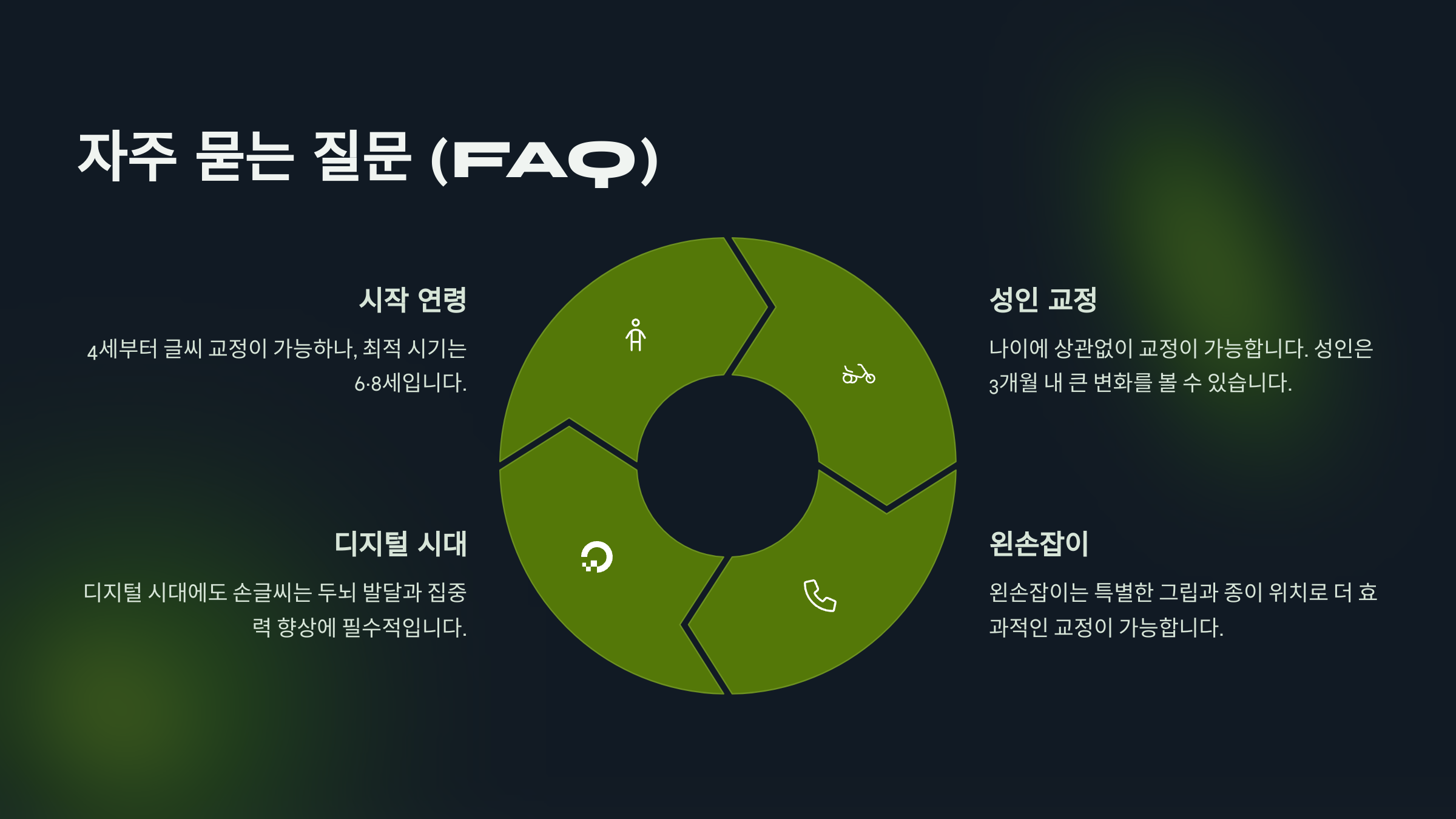 Q1. 글씨 교정은 정말 효과가 있나요?A1. 네, 꾸준히 연습하면 확실히 효과가 있어요. 글씨 교정은 손의 근육 기억을 개선하고, 자신감을 높여줍니다. 특히 2주 정도 꾸준히 하다 보면 눈에 띄는 변화를 느낄 수 있어요!