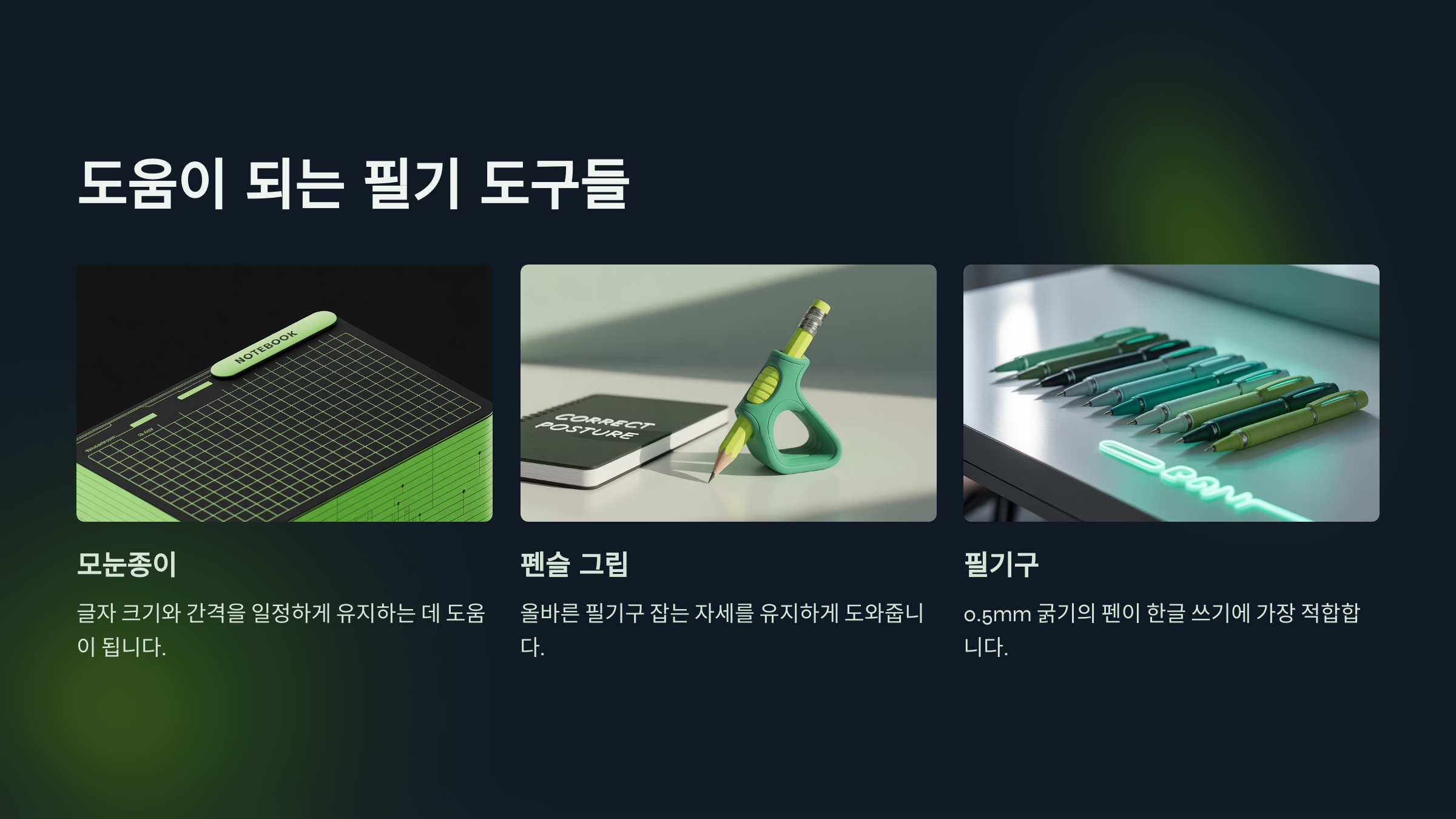 그럼 다음 박스에서는 글씨를 교정하는 데 도움이 되는 ‘필기 도구’에 대해 알아볼게요! 도구 하나만 바꿔도 결과가 확 달라진답니다 🖊