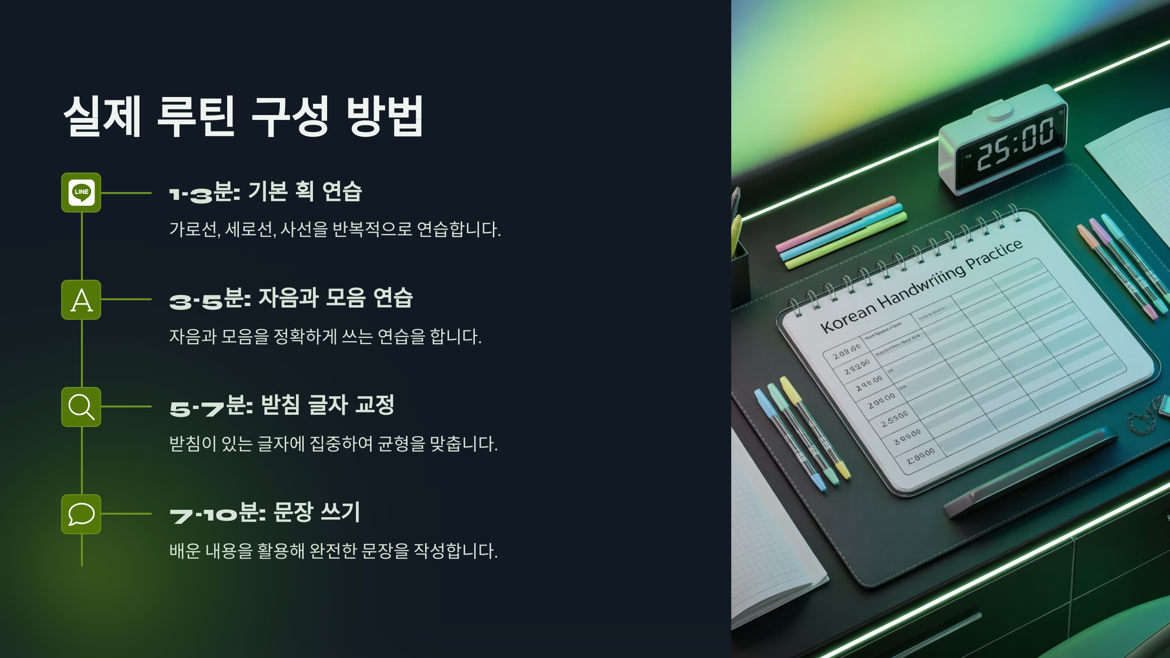 실제 글씨 교정 루틴은 간단하지만 체계적으로 짜는 것이 중요해요. 여기선 아침 10분 루틴을 기준으로 설명드릴게요. 이 루틴은 초보자도 쉽게 따라할 수 있도록 설계되어 있어요.1분 준비 – 자세 잡기 & 필기도구 정렬