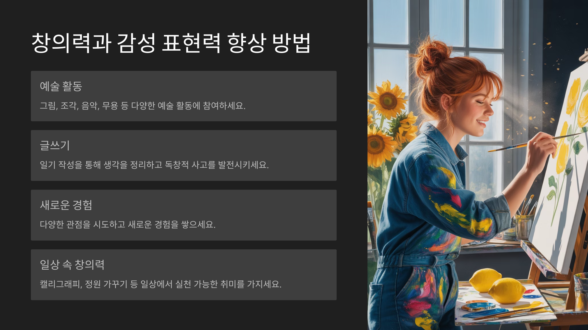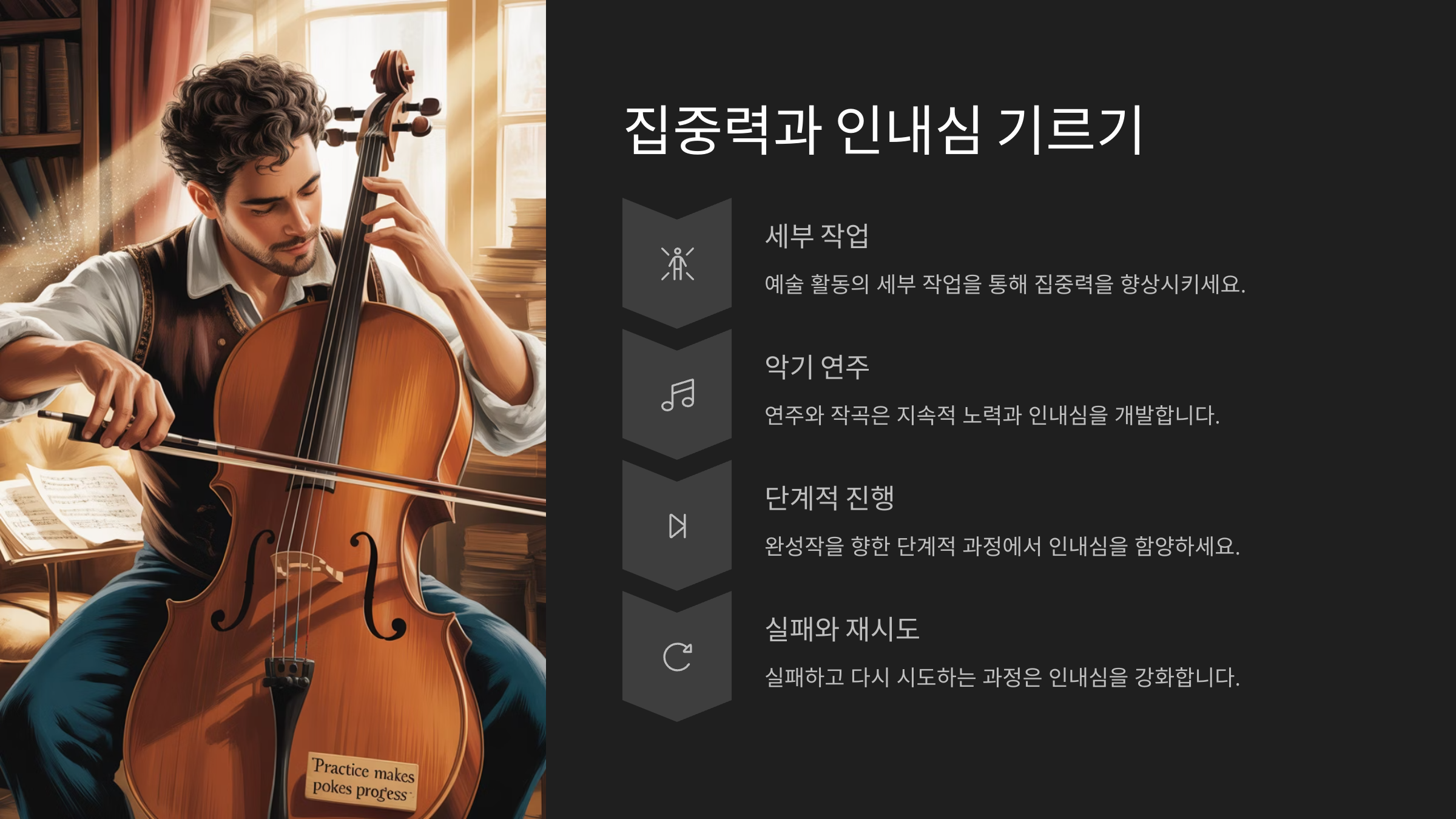방법 설명 기대 효과 글씨 반복 연습 한 문장을 반복적으로 써보기 집중력 강화 라인 연습 수직선/곡선 등 기본 획 그리기 손의 감각 향상 조용한 환경 조성 소음 없는 공간에서 글씨 쓰기 몰입도 상승 캘리그라피를 통해 집중과 인내를 기르면, 일상 속 다양한 상황에서도 차분함을 유지할 수 있어요. 특히 예민한 성격을 가진 사람들에게 큰 도움이 된답니다!