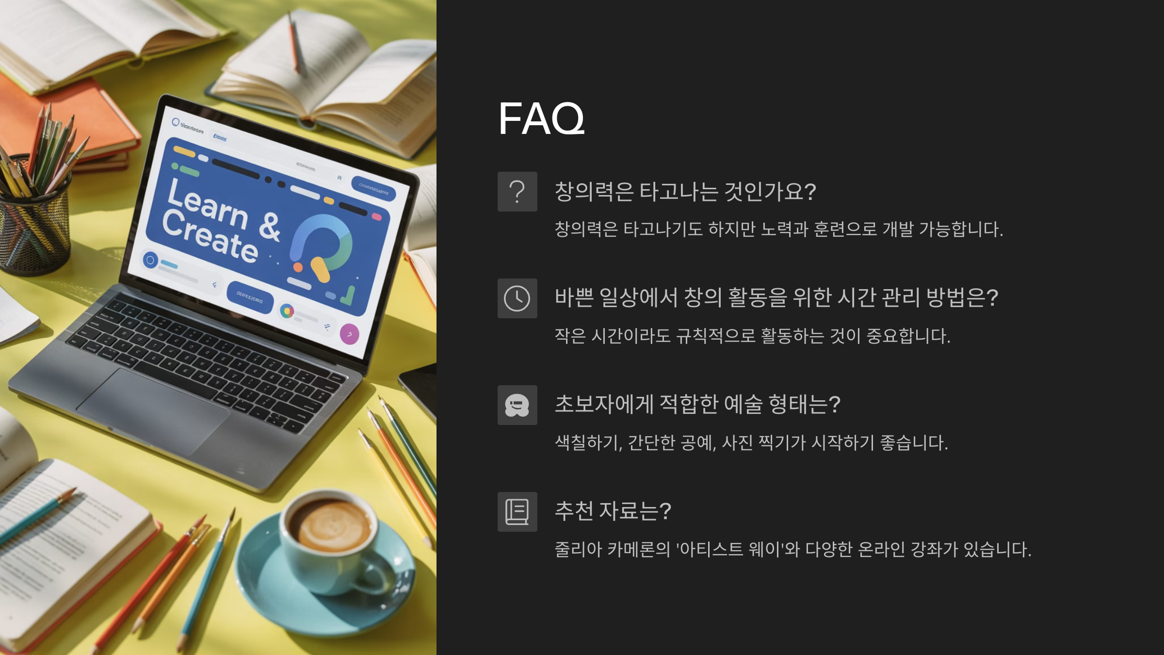 Q1. 캘리그라피를 처음 시작하려면 어떤 도구가 필요한가요?A1. 기본적으로 붓펜, 연습용 종이, 가이드북 하나면 충분해요. 천천히 시작하는 게 중요하답니다!
