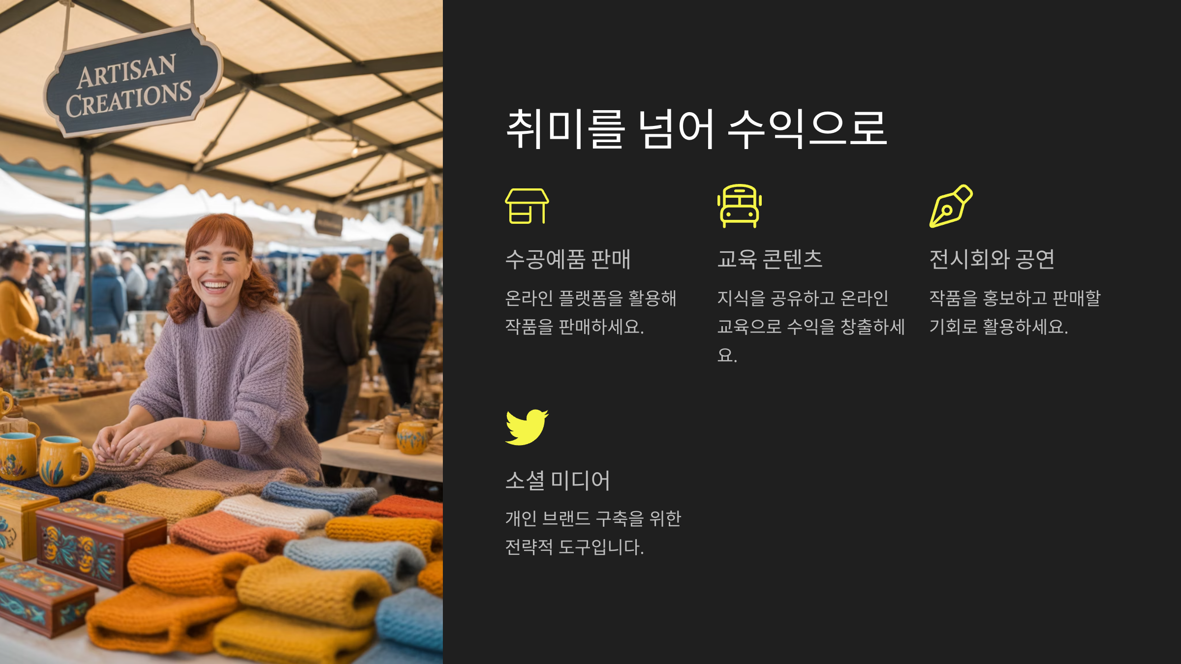 요즘은 캘리그라피로 부업을 시작하는 사람들도 많아요. SNS에 작품을 올리거나, 온라인 클래스 플랫폼에서 강사로도 활동할 수 있어요. 또는 캘리그라피를 활용한 문구 제품을 직접 제작해 판매하기도 하죠.