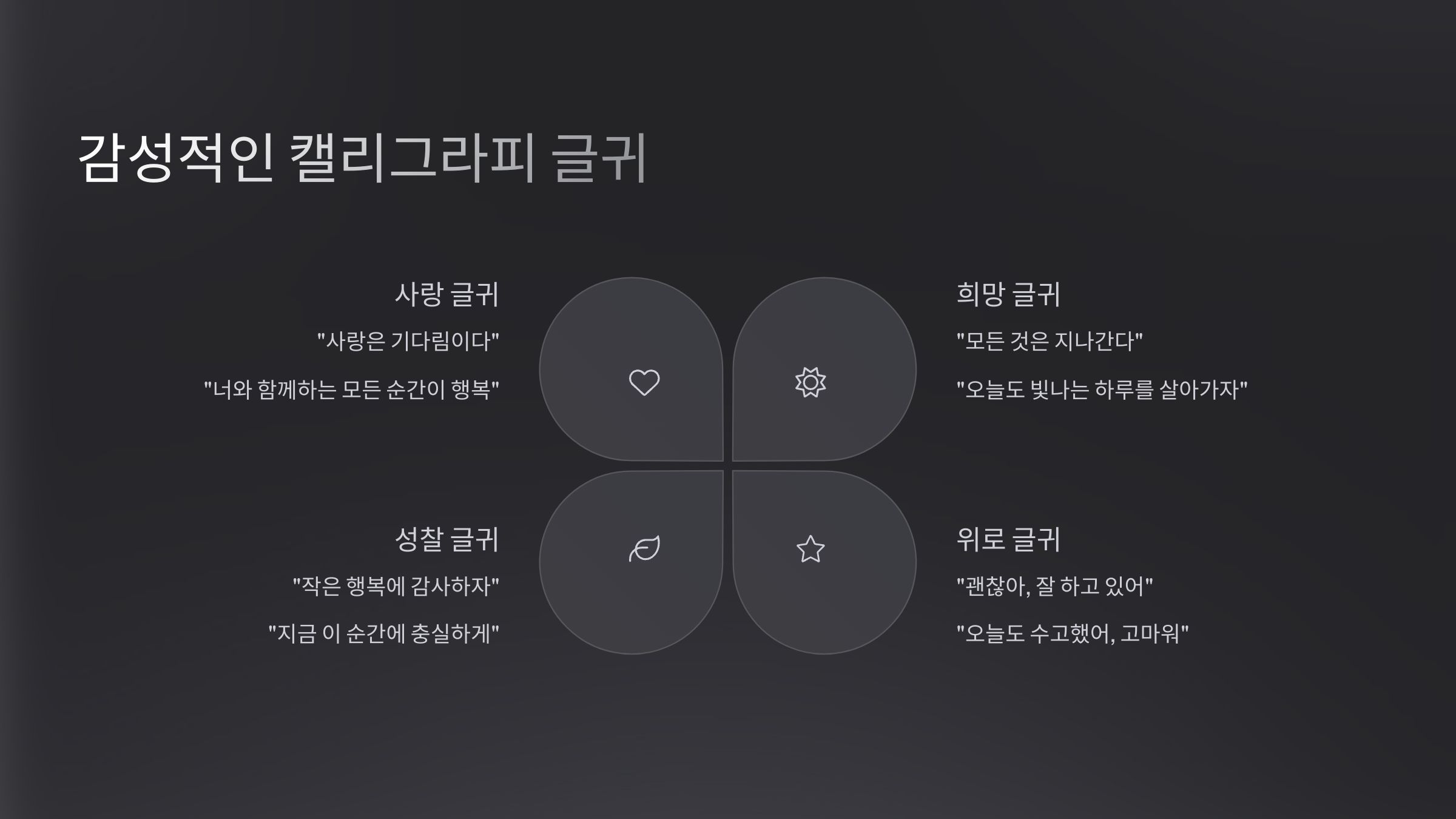 분류 글귀 스타일 추천 분위기 위로 짧고 부드러운 어조 다이어리, 힐링 노트 사랑 감정 중심, 따뜻한 표현 러브레터, 포토북 🌈 희망과 긍정의 말들