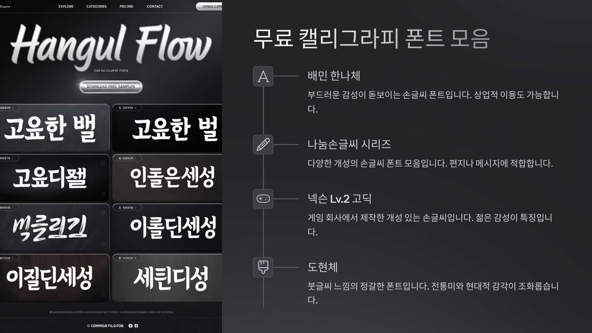 이 폰트들은 디자인 작업, SNS 게시물, 카드 제작, 영상 자막 등에 유용하게 쓰일 수 있어요. 직접 손으로 쓰기 어려운 경우, 감성적인 느낌을 폰트로 표현해보는 것도 훌륭한 대안이에요. 아래에서 대표적인 무료 캘리그라피 폰트를 소개할게요 🖍