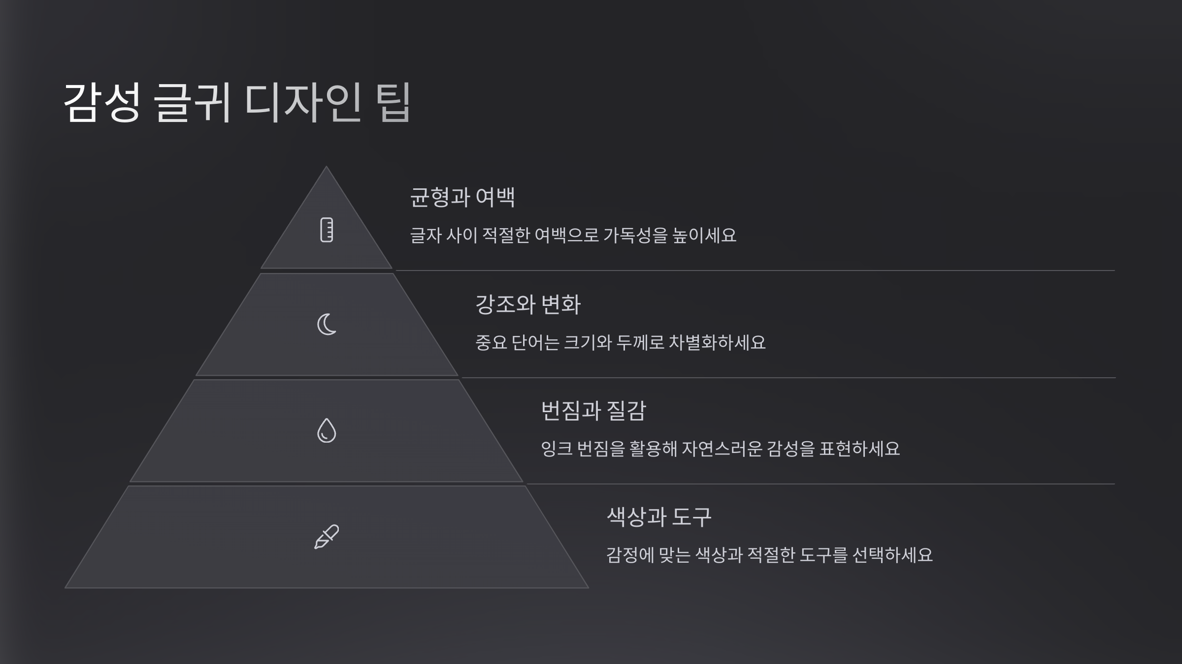요소 디자인 팁 활용 효과 여백 중앙 정렬, 주변 비우기 감성 집중도 상승 배경 파스텔, 질감 종이 추천 분위기 강화 글자 굵기 감정에 따라 조절 감정 전달력 향상 속도 천천히, 호흡을 담아 감성의 깊이 전달 캘리그라피는 그리는 글이에요. 글씨가 곧 그림이 되는 마법이죠. 폰트나 디자인이 다가 아니에요. 당신의 손끝에서 나오는 감정이 곧 최고의 디자인이 될 수 있어요 💫