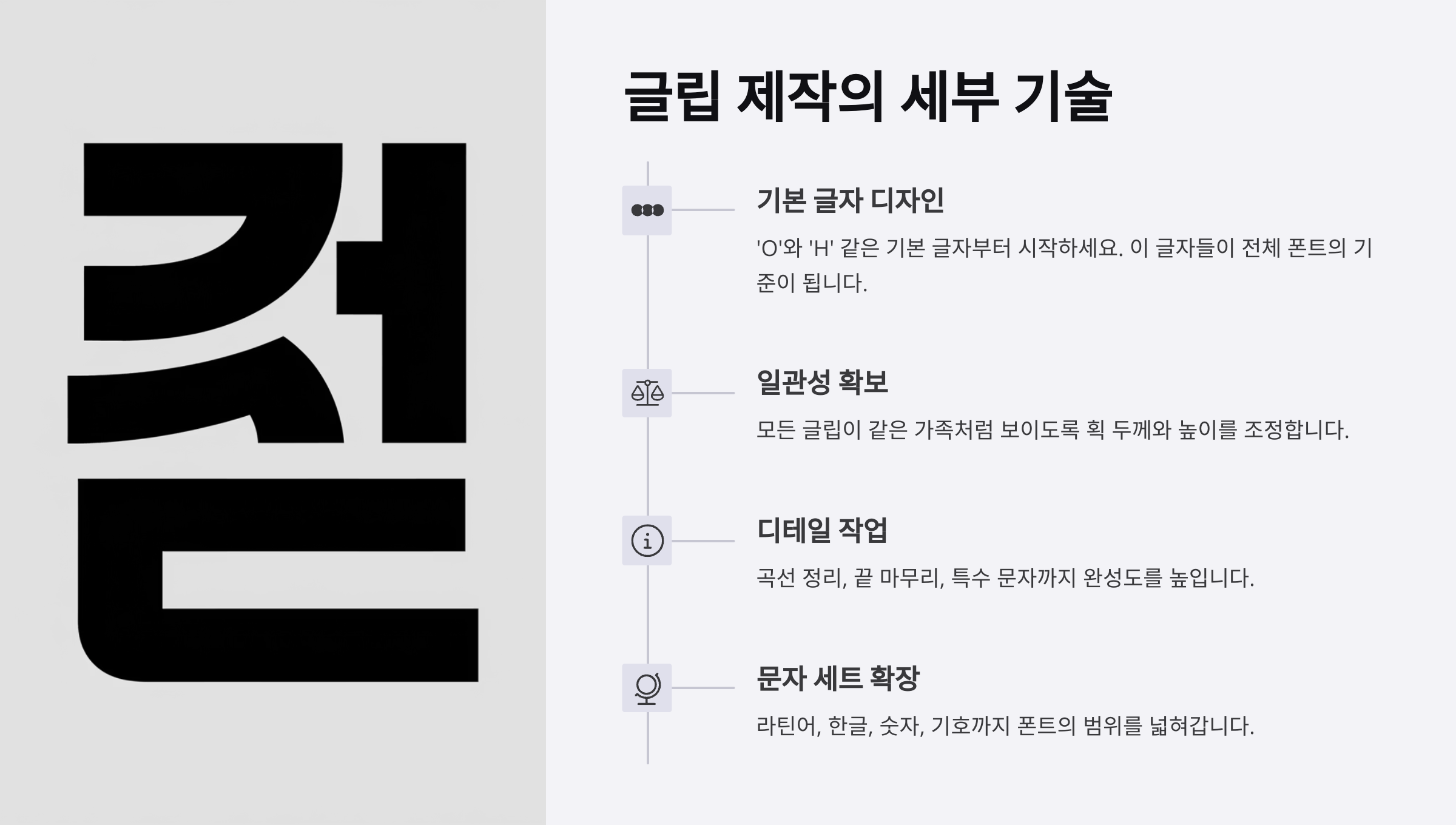 항목 설명 자간(Kerning) 문자 사이 간격 조정, 시각적으로 고르게 행간(Leading) 줄과 줄 사이 간격, 가독성 결정 요소 테스트 문장 글자 모양이 다양한 단어로 시각 점검 시각 중심선 글자가 수평, 수직 기준에 맞게 배치되었는지 확인 이 부분은 정말 디자이너의 감각이 빛나는 순간이에요. 정해진 공식은 없지만, 글자가 너무 붙거나 떨어지지 않도록 균형감을 찾는 게 중요해요. 잘 다듬어진 간격은 폰트 전체의 품질을 한 단계 끌어올려준답니다. ✨
