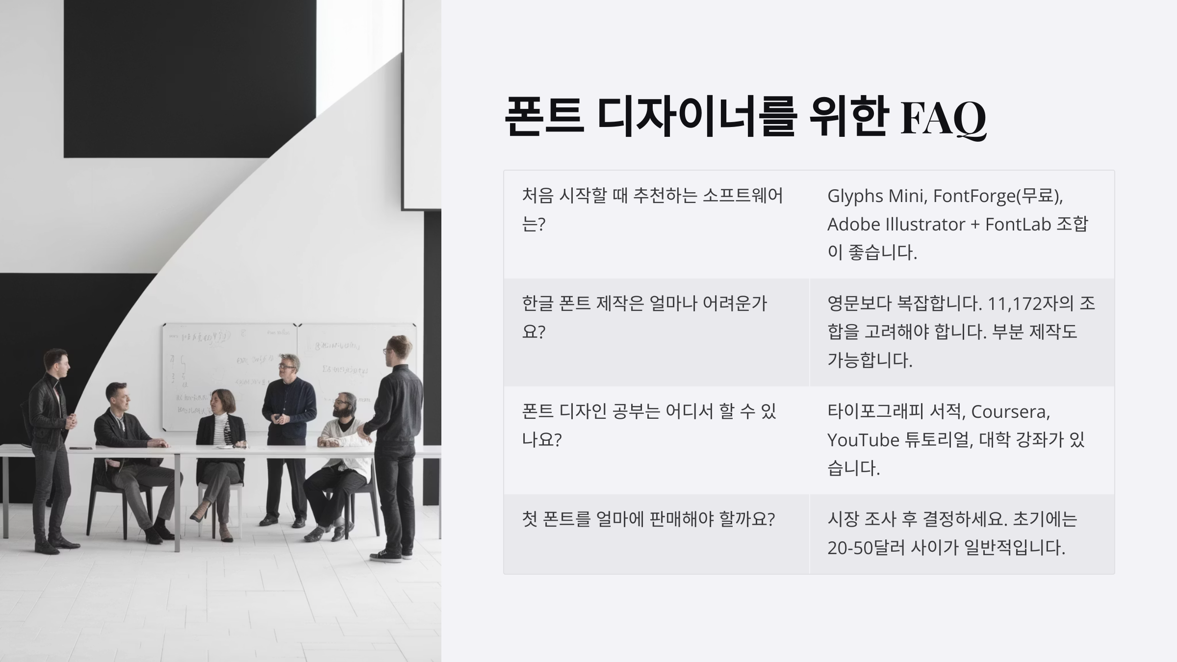 A1. 간단한 영문 폰트는 2~3일, 한글은 기본 글립만 만들어도 최소 2~3주가 걸려요. 완성도에 따라 몇 달 이상 걸릴 수도 있어요.