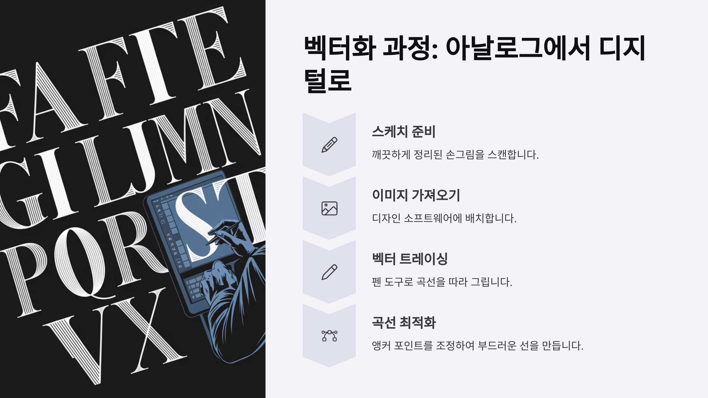 먼저, 드로잉한 이미지를 불러온 후 펜 툴을 이용해 각각의 글자를 따라 그리며 ‘벡터 경로’를 만들어요. 이때 각 점(노드)의 위치와 곡선 핸들 조절이 중요한데, 너무 많아도 안 되고, 너무 적으면 모양이 왜곡되기 쉬워요. 꼭 필요한 곳에만 점을 배치하는 게 핵심이에요.