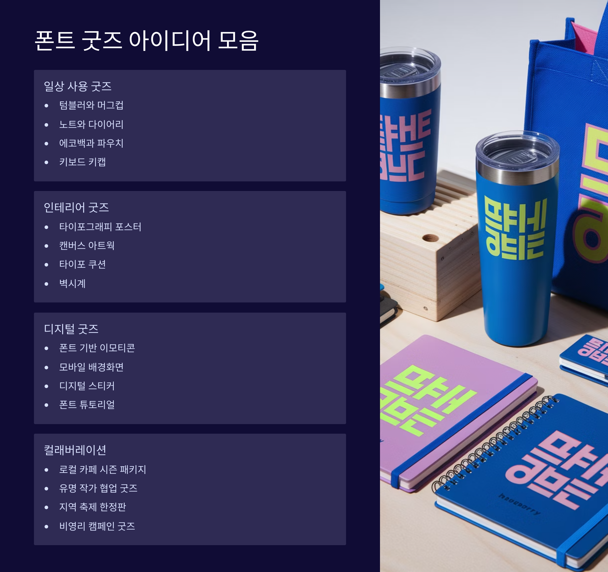 👉 다음 섹션은 "폰트 굿즈 아이디어 모음"이에요. 내 폰트로 만들 수 있는 굿즈 제품 아이템들을 종류별로 알려드릴게요!