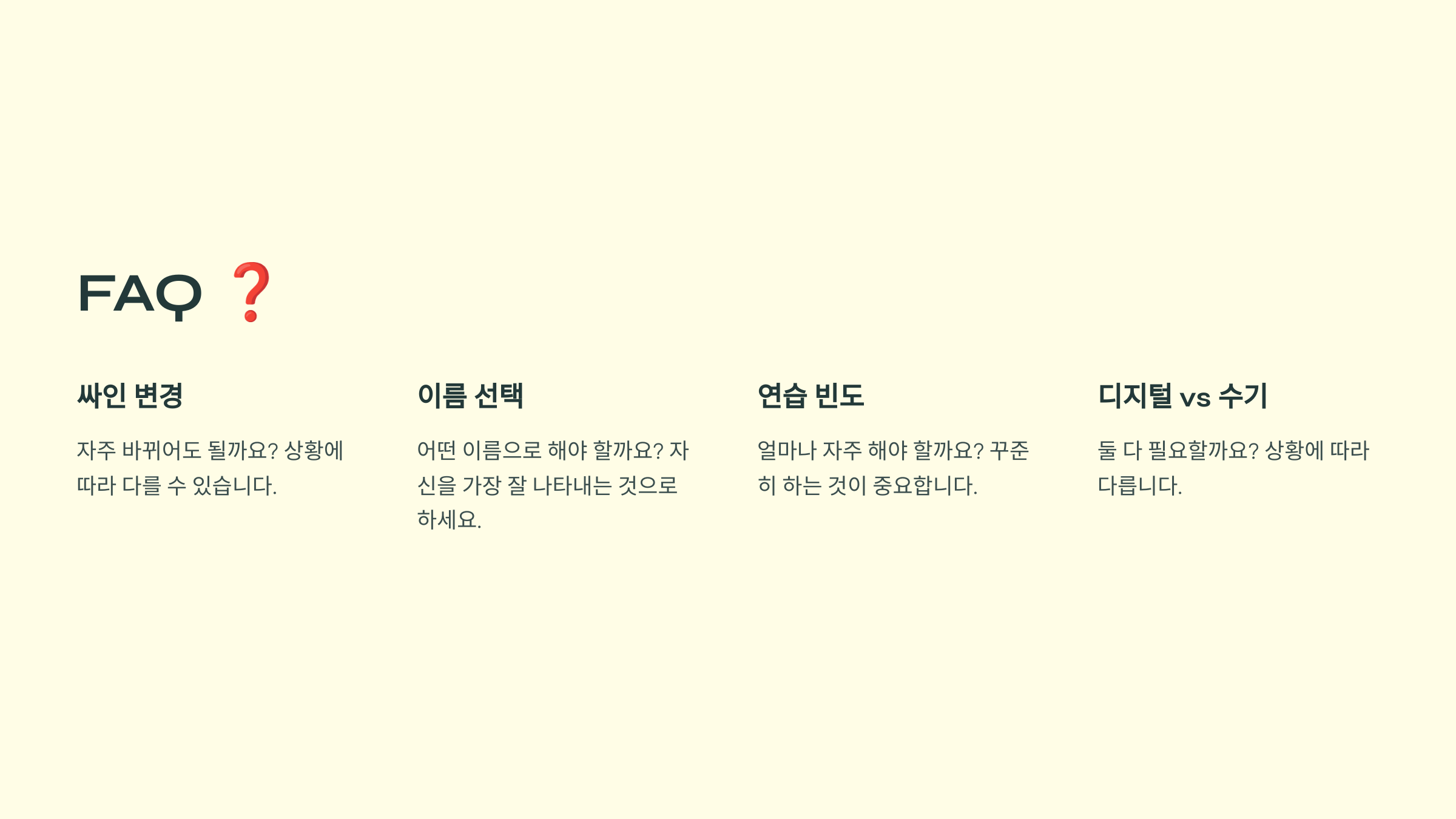 A1. 네! 기본적인 연습을 통해 누구나 멋진 싸인을 만들 수 있어요. 이니셜을 활용하거나, 필기체를 변형하는 방법부터 시작해 보세요. ✍