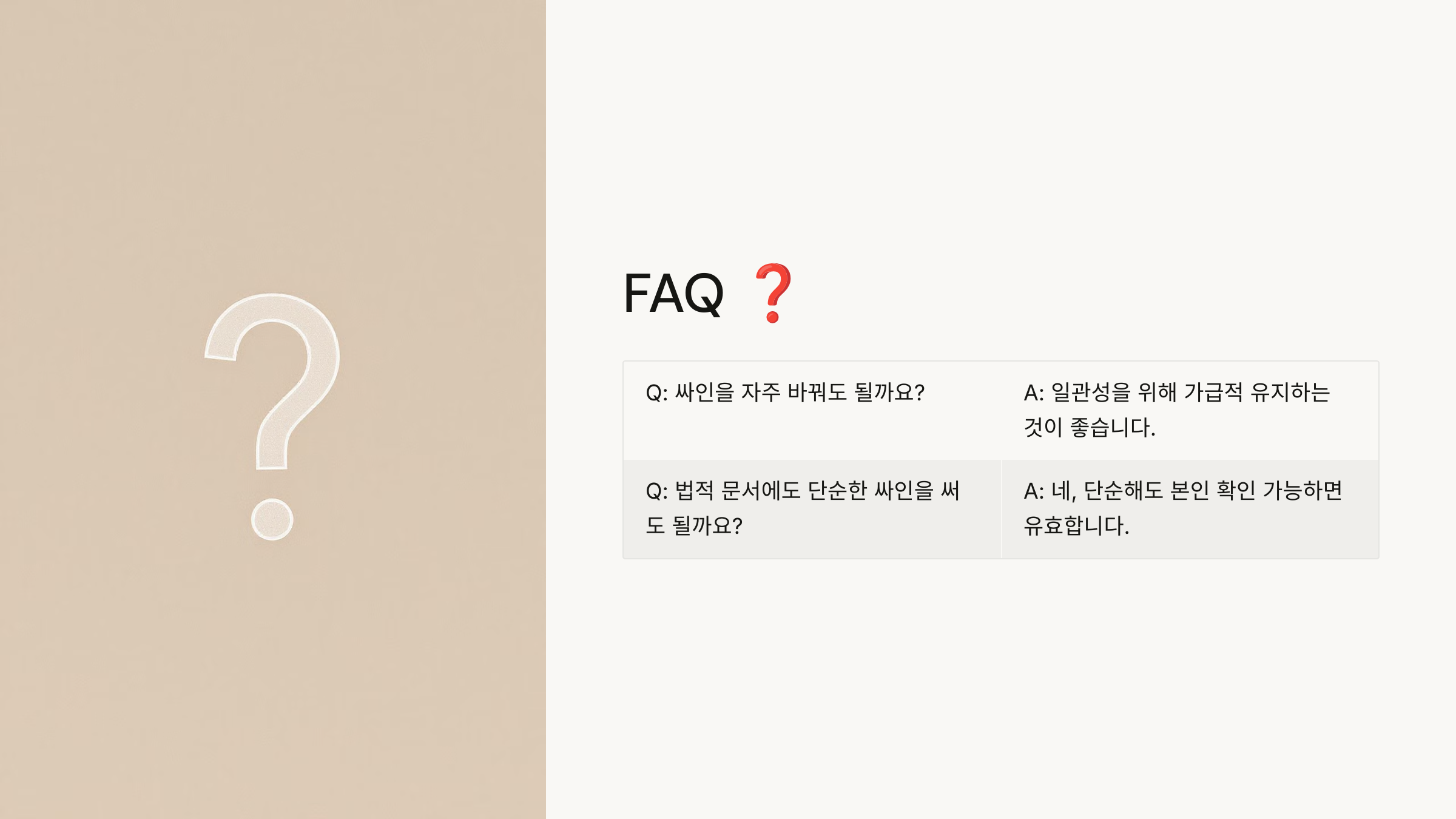 이제 싸인과 관련된 궁금증을 해결할 시간! FAQ에서 자주 묻는 질문을 살펴볼까요? ❓