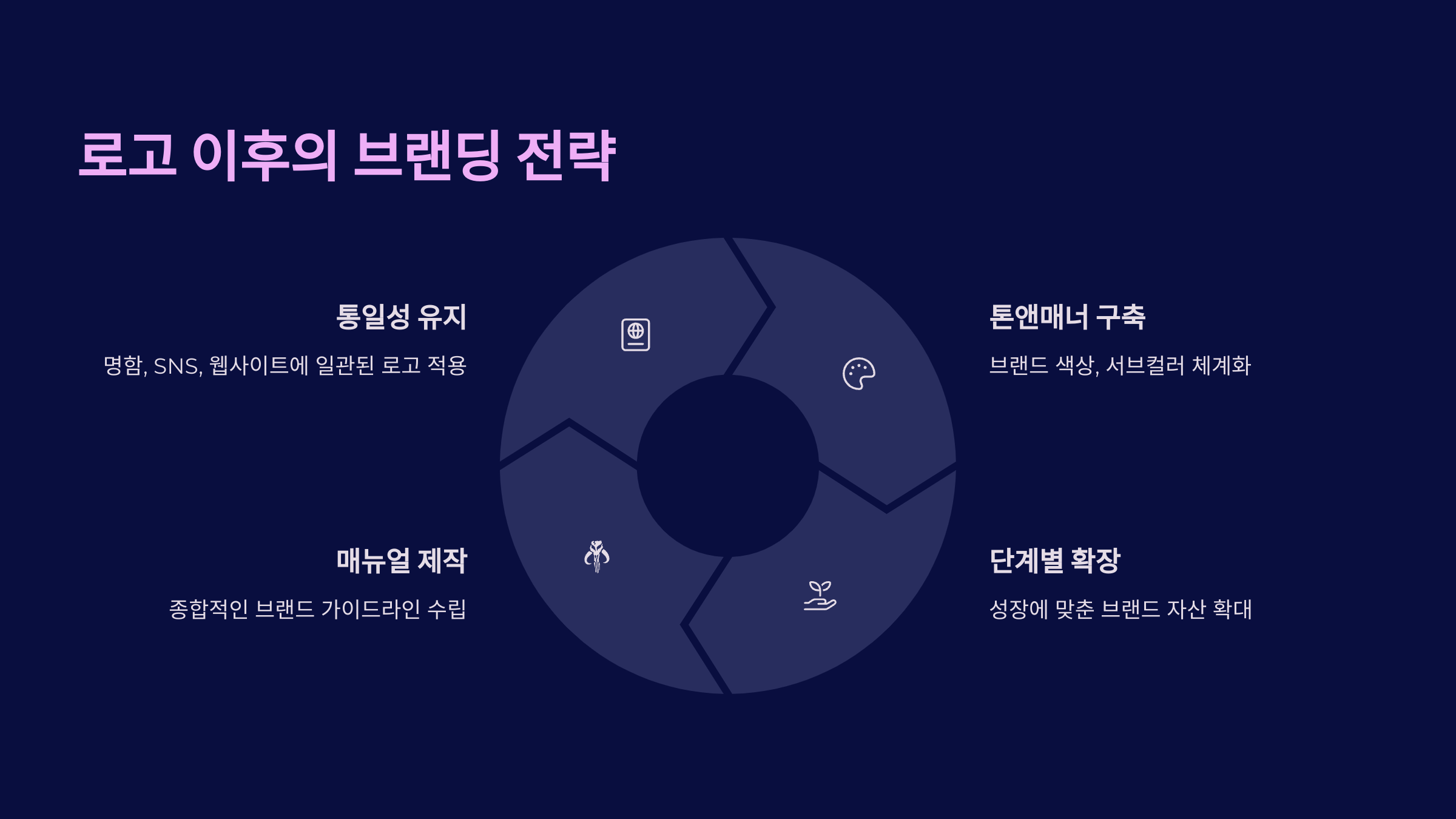 로고를 만들었다고 브랜딩이 끝난 건 아니에요. 오히려 이제 시작이에요! 로고는 브랜드 정체성을 시각적으로 표현하는 출발점이고, 그 로고를 어떻게 활용하느냐에 따라 브랜드의 인식이 달라져요.우선 로고를 적용할 수 있는 다양한 매체를 정리해보면 좋겠어요. 예를 들어 명함, SNS 프로필 이미지, 홈페이지, 포장지, 굿즈, 이메일 서명 등 브랜드가 노출되는 모든 지점에서 로고가 일관되게 사용되어야 해요.