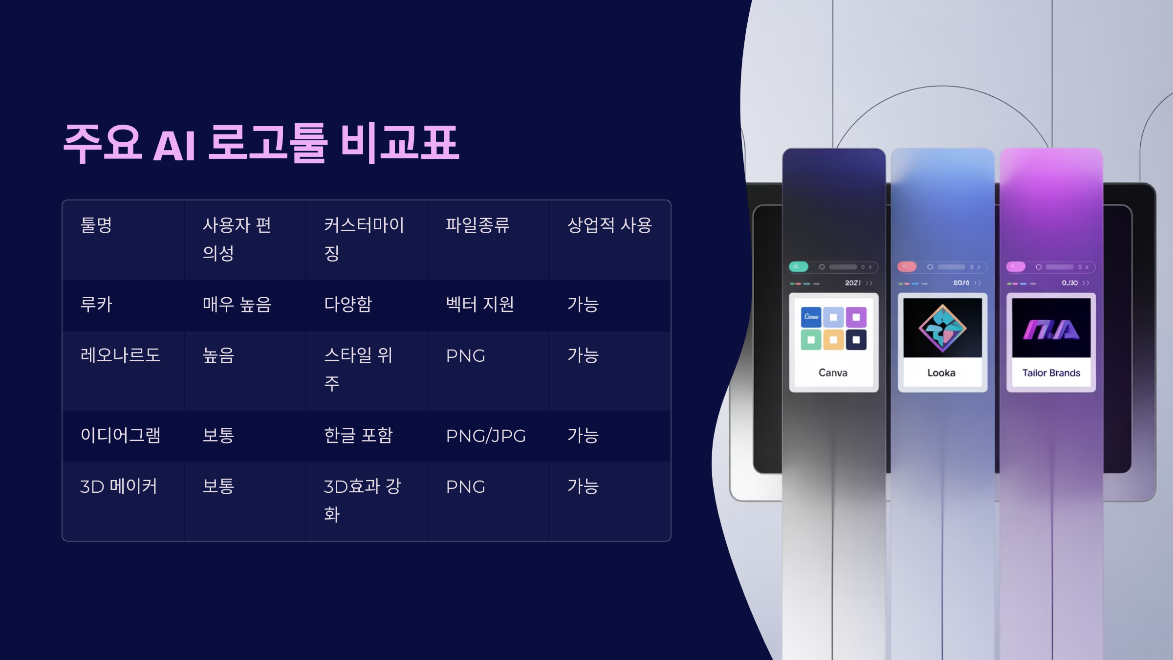 다음은 실제로 어떤 로고툴들이 시장에서 사용되고 있는지 비교해서 소개할게요!