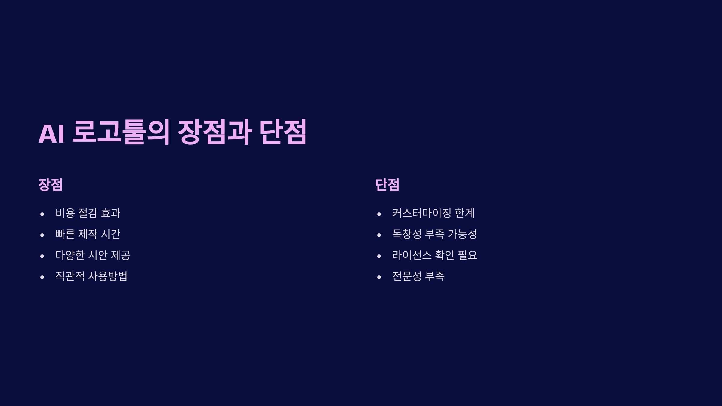 이제 AI 로고툴의 장점과 단점을 정리해보면서, 어떤 상황에서 유리한지, 또 조심할 점은 무엇인지 이야기해볼게요!
