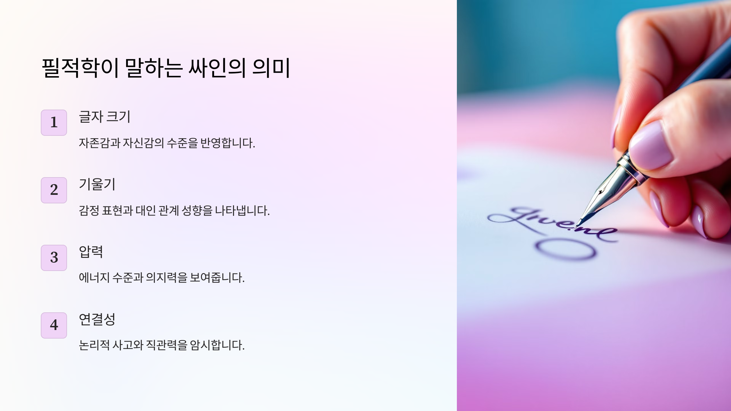 싸인의 크기, 필체, 기울기, 꾸밈 정도에 따라 사람의 성향을 알 수 있다고 해요. 예를 들어, 크고 강한 필체의 싸인은 자신감 넘치는 성격을 나타내고, 작고 조용한 싸인은 섬세하고 내성적인 성격을 반영할 가능성이 높아요. 그럼 싸인과 성격의 관계를 깊이 있게 알아볼까요? 🔍