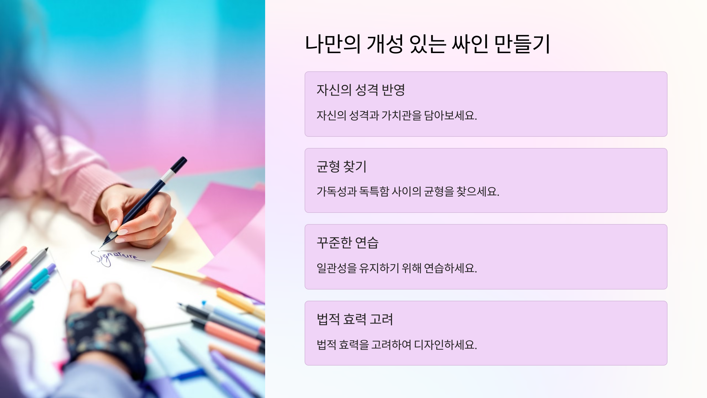 이처럼 싸인은 그 사람의 성격과 가치관을 반영해요. 그렇다면 우리는 어떻게 나만의 개성 있는 싸인을 만들 수 있을까요? 🤩