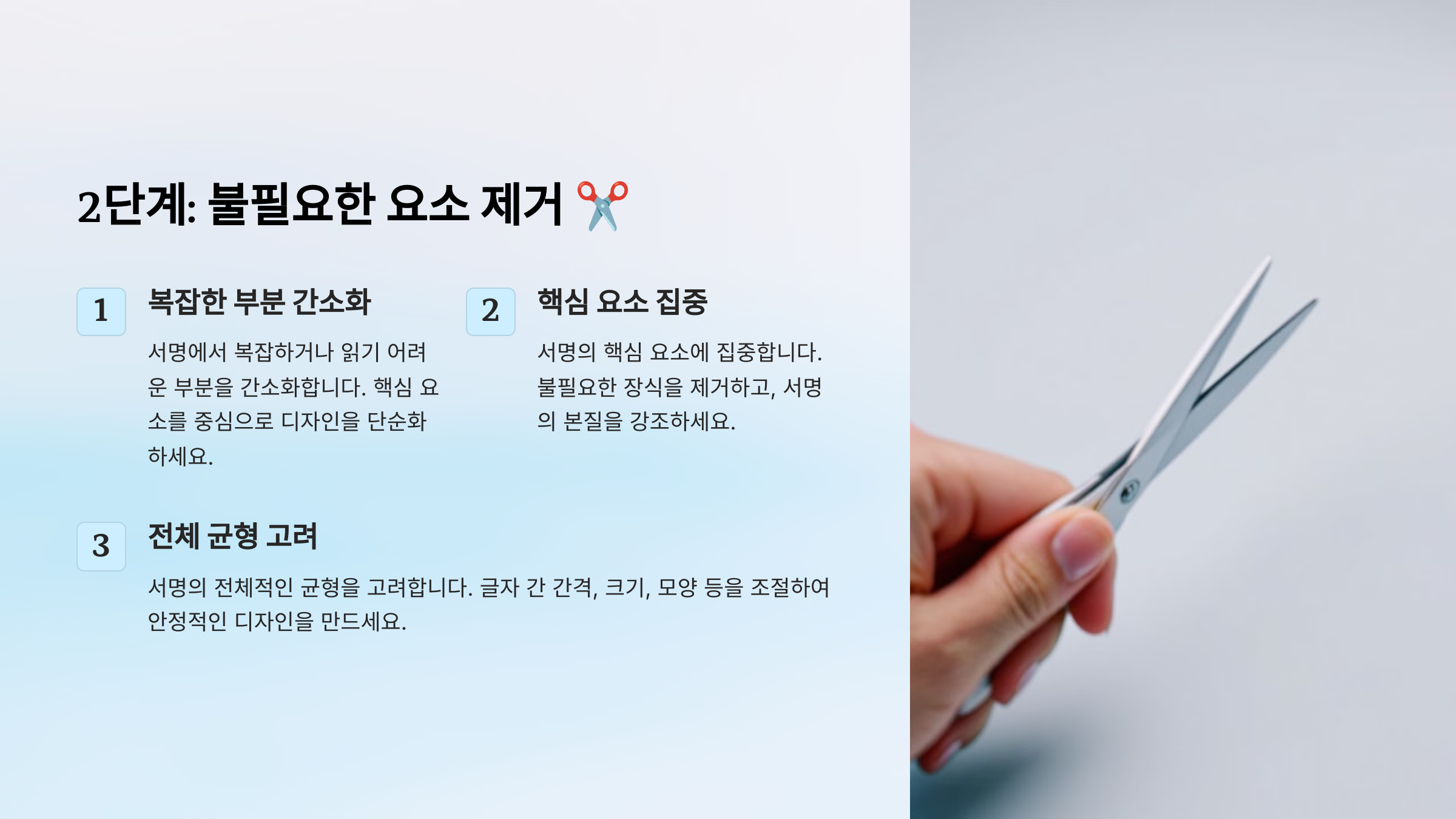싸인이 복잡하면 빠르게 작성하기 어렵고, 일관성을 유지하기 힘들어요. 따라서 불필요한 장식과 복잡한 획을 줄여주는 과정이 필요해요. ✍🔥