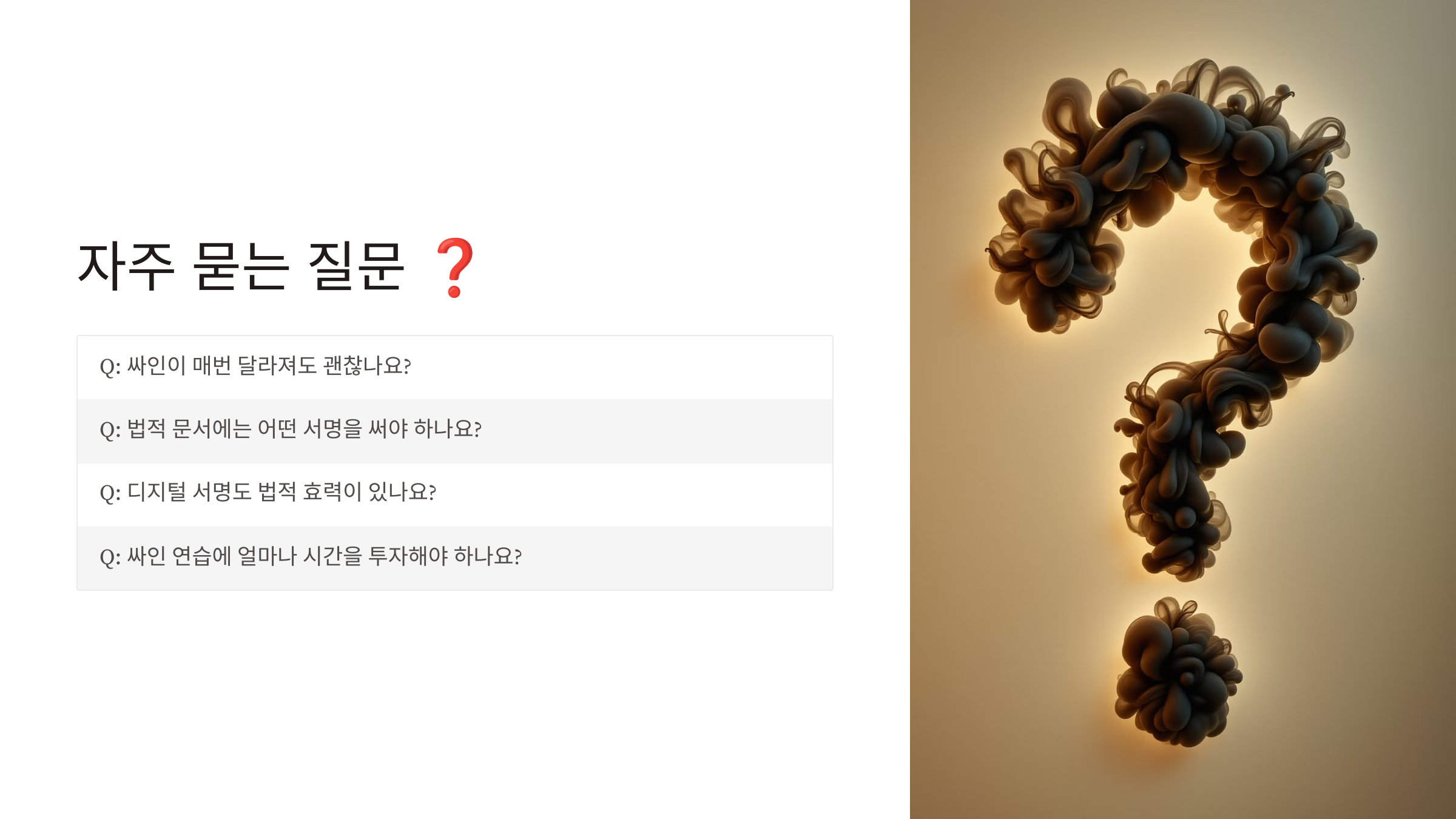 연습 방법 설명 매일 5분 연습 짧은 시간이지만 꾸준히 연습하기 디지털 & 종이 싸인 병행 온라인과 오프라인에서 동일한 스타일 유지 거울 보며 균형 확인 싸인의 대칭성과 균형 체크 빠른 속도 연습 5초 안에 싸인을 완성하는 습관 만들기 세련되게 다듬기 필요할 때 조금씩 변형하며 개선하기 이제 싸인에 대한 궁금증을 해결할 시간! FAQ에서 자주 묻는 질문을 정리해 볼까요? ❓