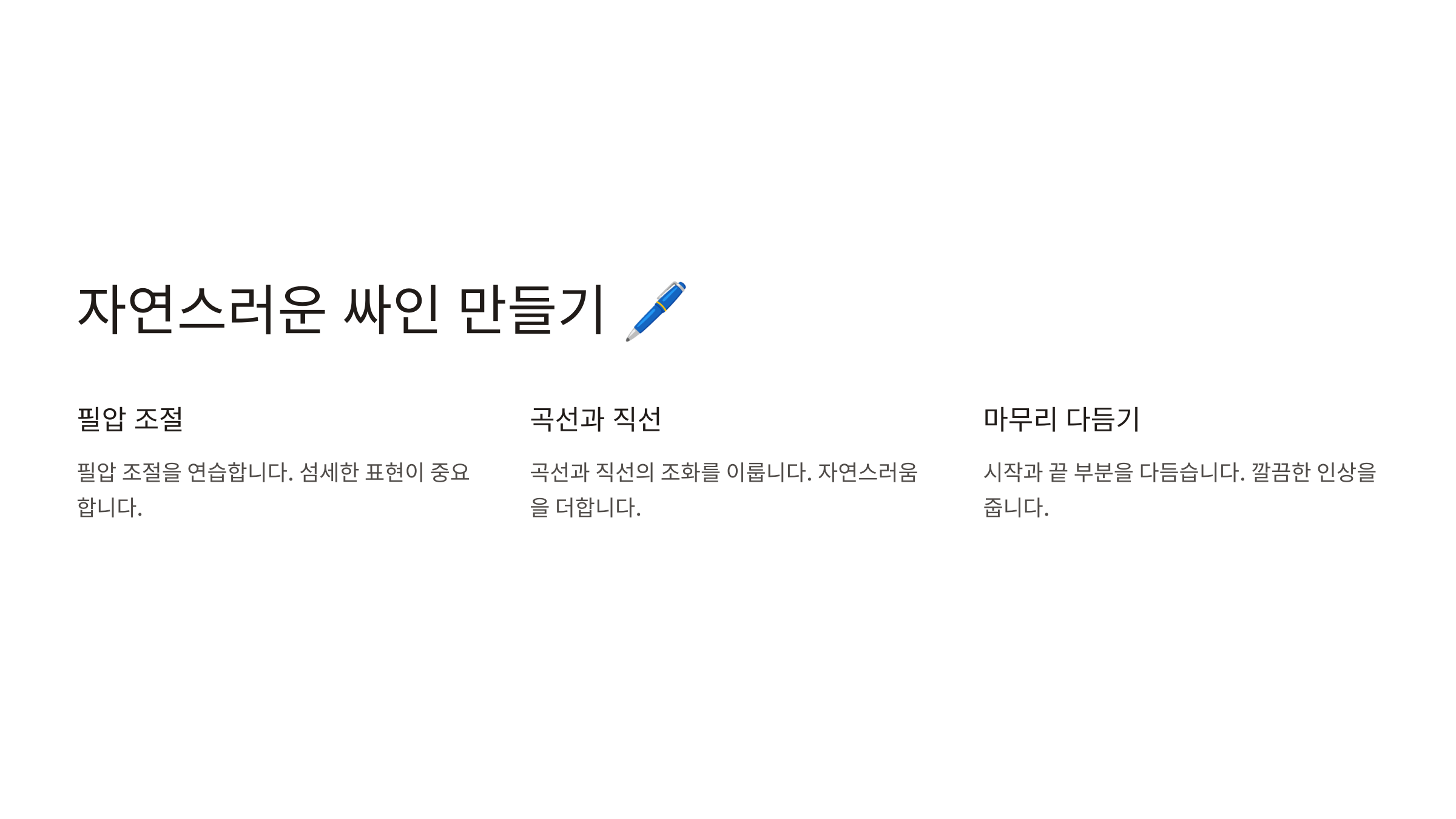 싸인은 한 번에 완성되는 것이 아니라 꾸준한 연습을 통해 손에 익혀야 해요. 일정한 스타일을 유지하면서도, 필요에 따라 유연하게 변형할 수 있는 능력도 중요하답니다! ✍