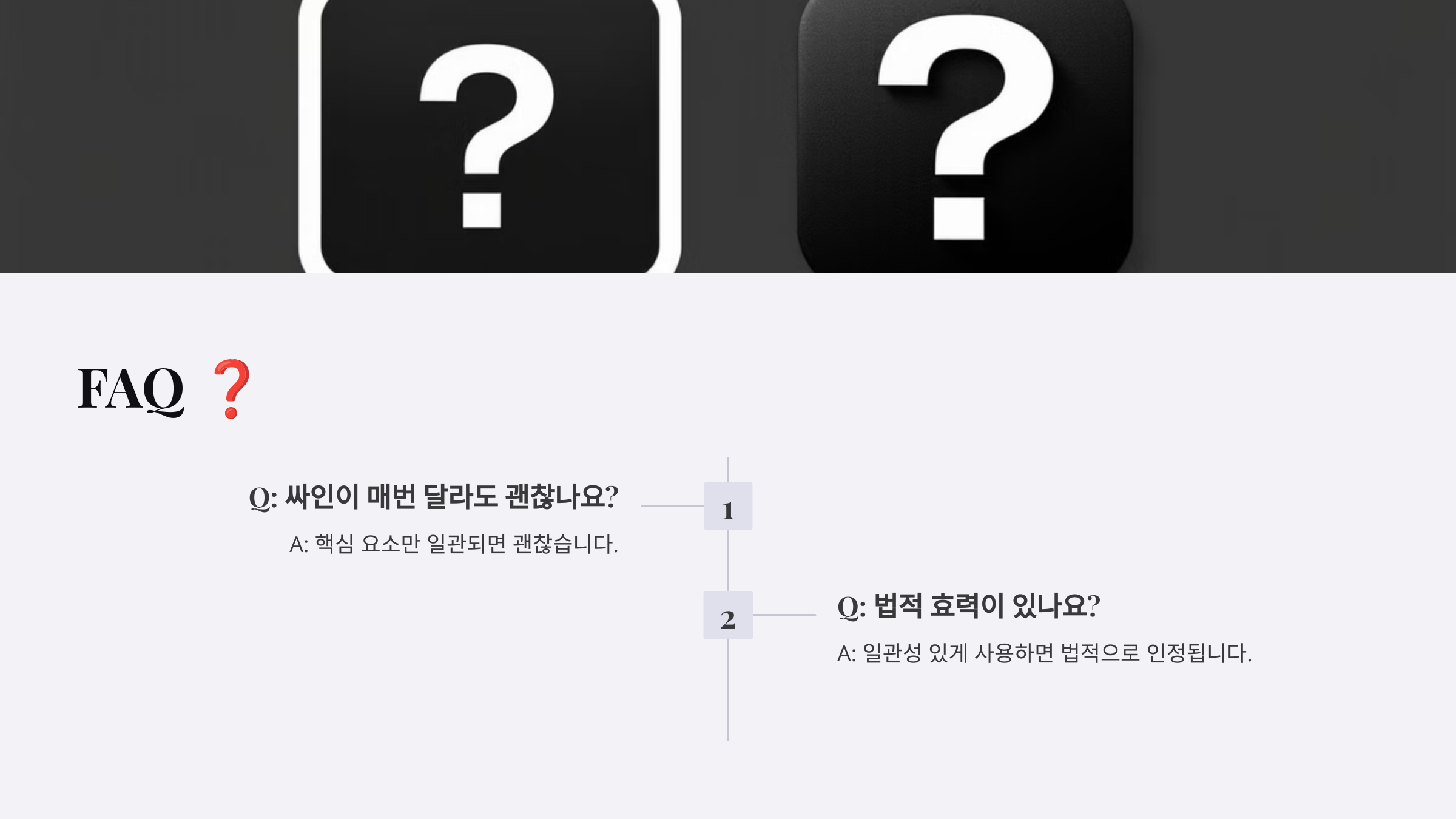 A5. 개인적으로 사용하는 싸인은 자유롭게 바꿀 수 있어요! ✔ 하지만 공식 문서에 등록된 싸인은 변경 시 다시 등록 필요 ✔ 한 번 정한 싸인은 꾸준히 사용하는 것이 신뢰도 상승