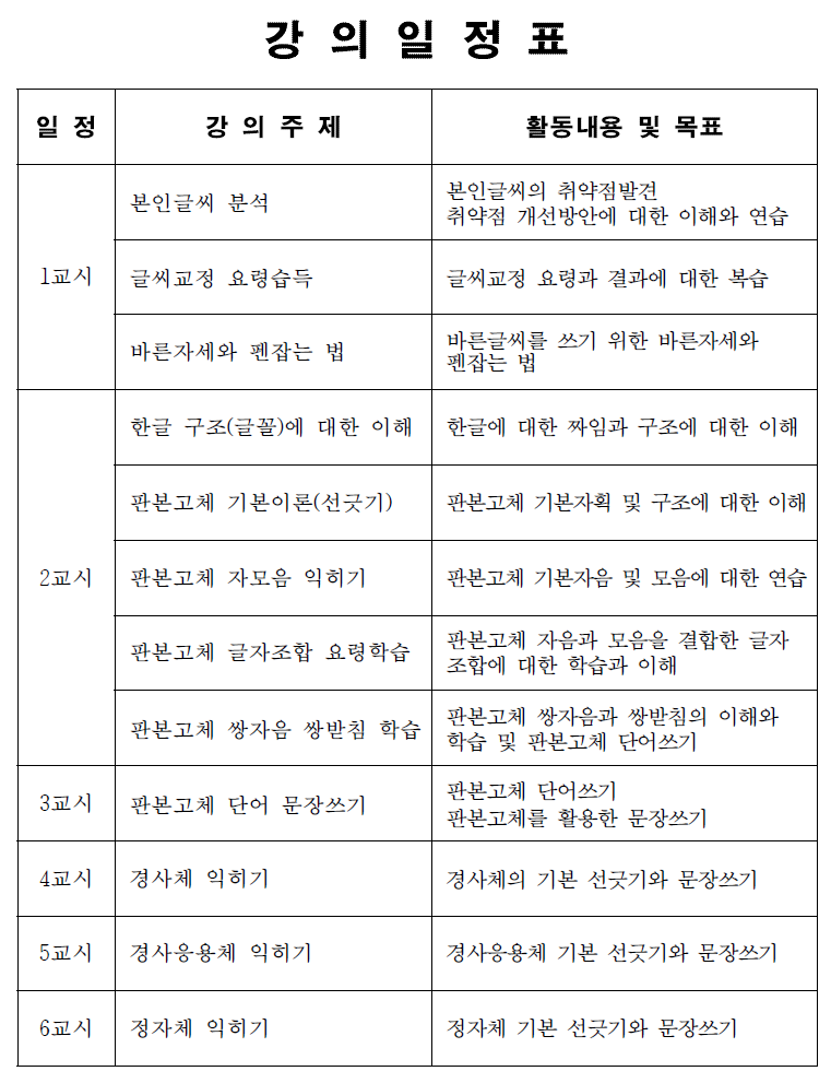 소통(가독성) → 디자인(균형/조화)적 요소 가미 → 서법(書法) → 서예(書藝) → 서도(書道)아래는 이후 본 블로그에 게재될 필봉샘의 글씨교정 강의 일정표입니다.