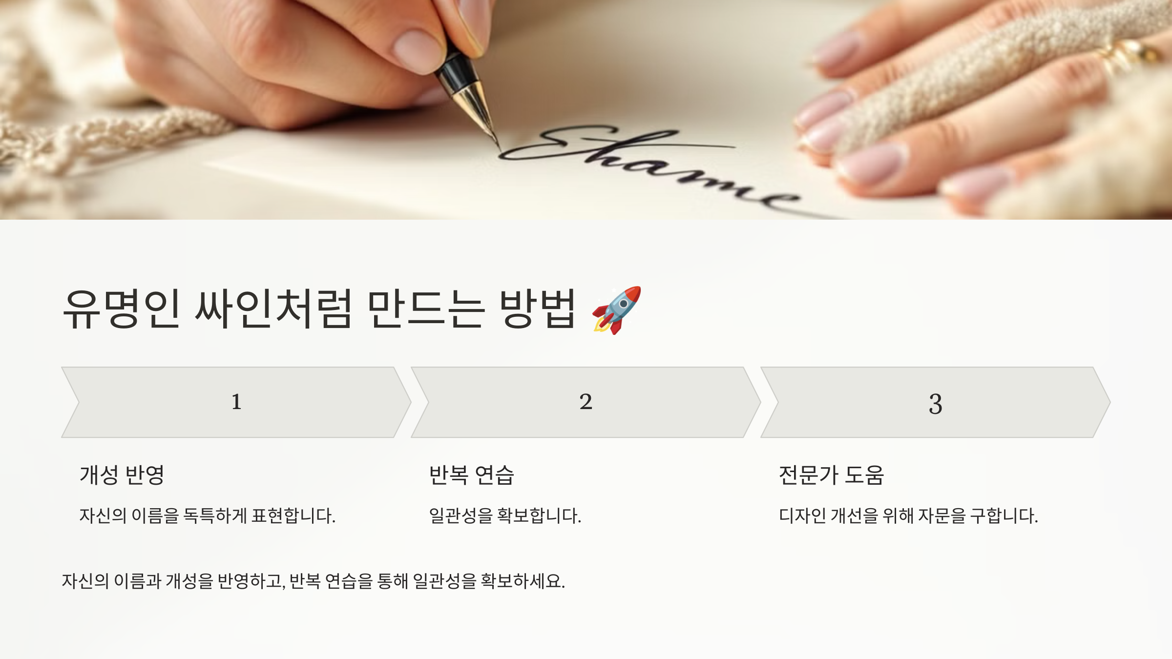 유명인들의 싸인은 단순한 서명이 아니라, 하나의 브랜드처럼 활용돼요. 이제 그들의 싸인에서 배운 요소를 활용해 나만의 멋진 싸인을 만들어볼까요? ✍