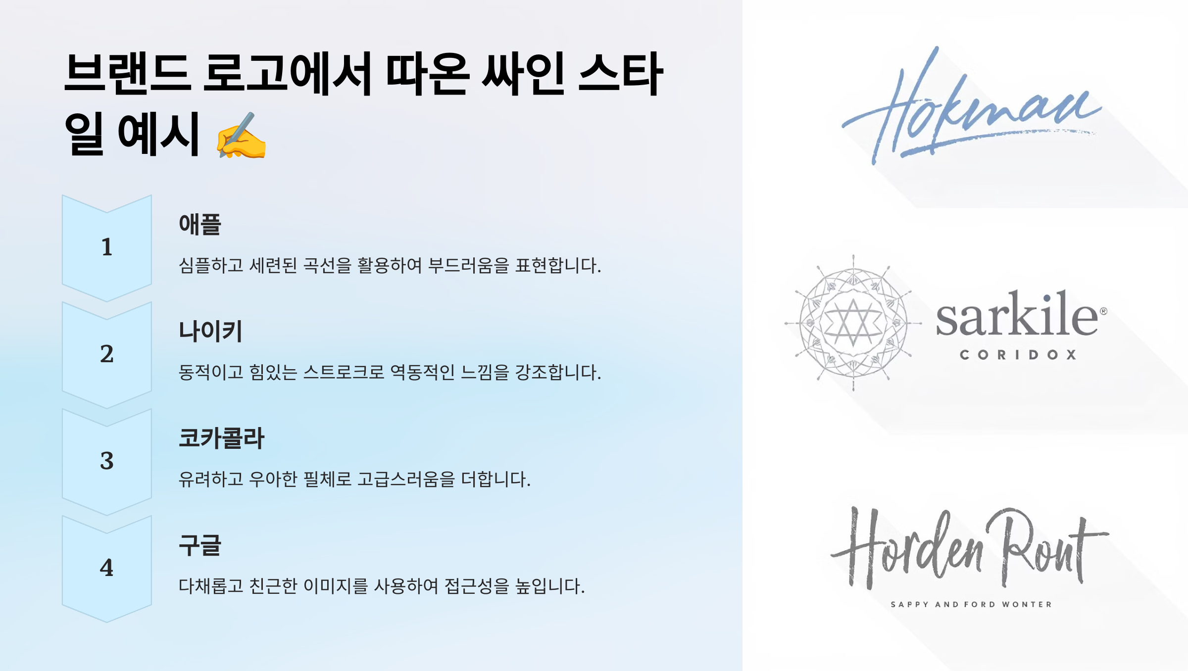 이제 브랜드 로고에서 따온 싸인 스타일 예시를 살펴볼까요? ✍