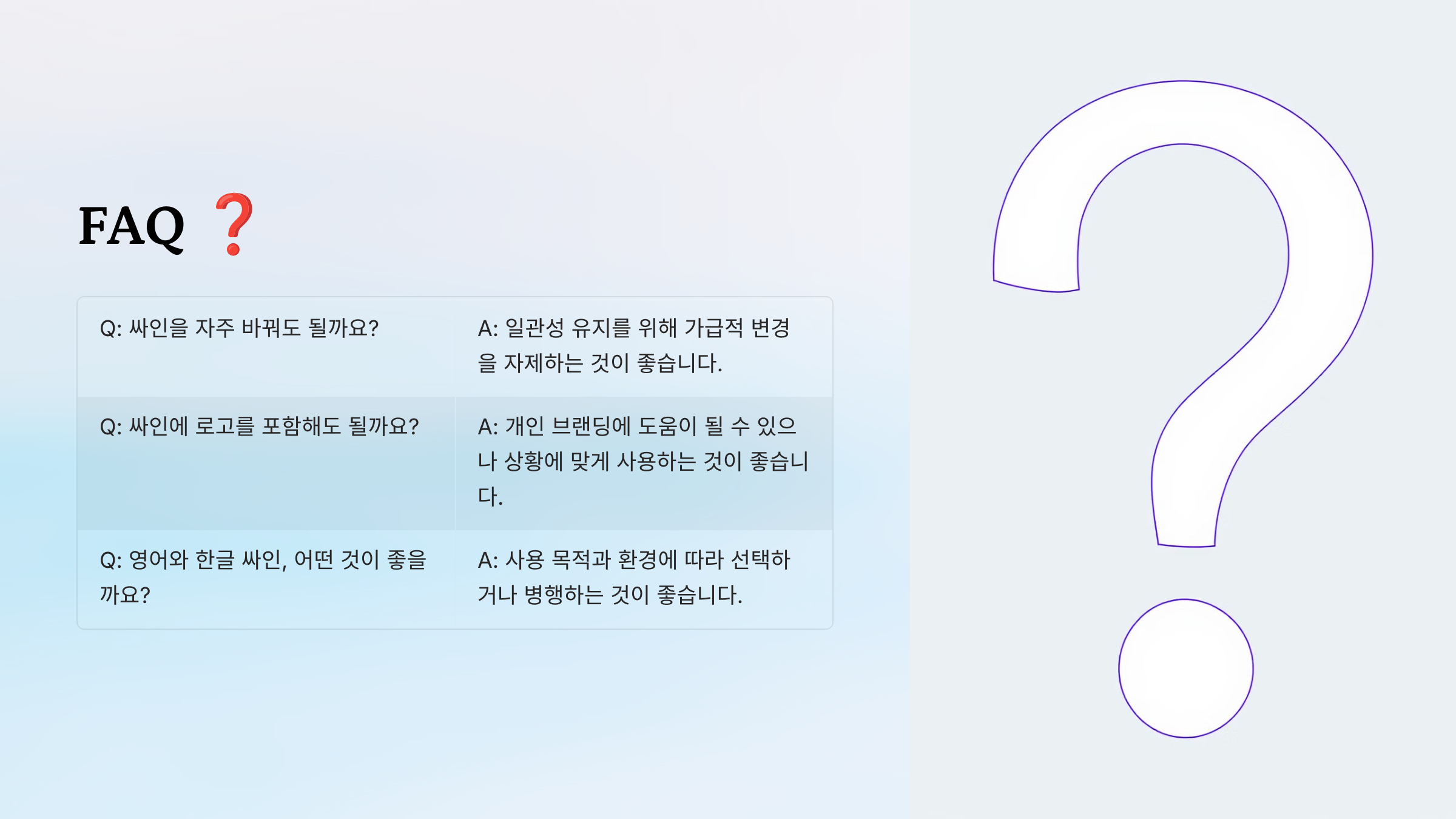 A3. 개인적인 싸인은 언제든 바꿀 수 있지만, 공식 문서에서는 신중해야 해요. ✔ 은행, 공공기관 등에 등록된 싸인은 변경이 필요할 수도 있음 ✔ 새로운 싸인을 정착시키기 위해 꾸준한 연습이 필수
