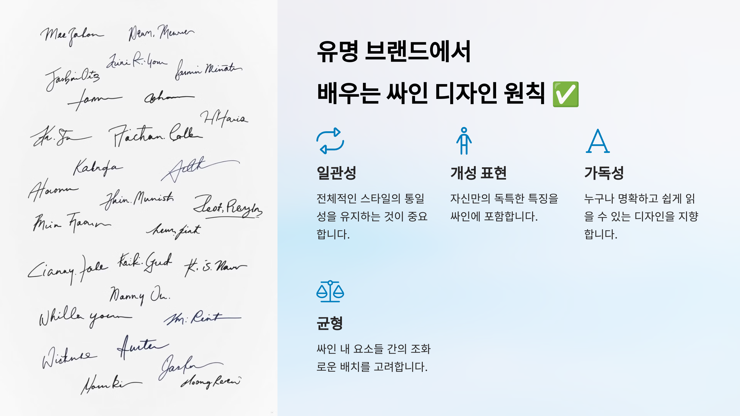 브랜드 로고처럼 싸인도 단순하면서도 강렬한 인상을 남겨야 해요. 유명 브랜드의 디자인 원칙을 참고하면 더욱 세련되고 기억에 남는 싸인을 만들 수 있어요! ✍🔥