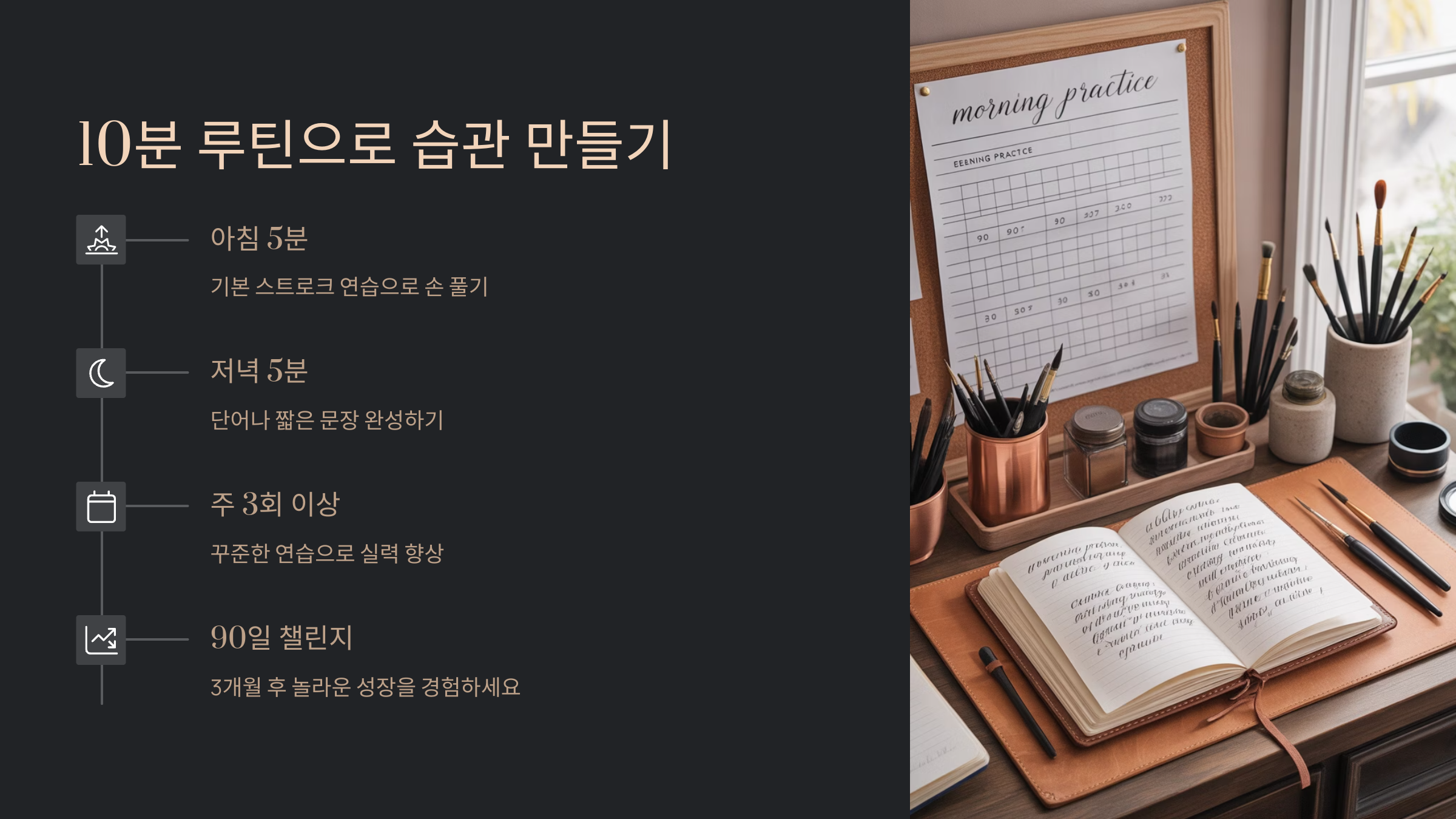 10분 루틴으로 습관 만들기 캘리그라피 실력을 키우는 데 가장 중요한 건 '꾸준함'이에요. 하루 10분씩 짧게라도 연습하는 루틴을 만들면, 어느 순간 글씨가 자연스럽고 예뻐져 있는 걸 느낄 수 있답니다. 아침이나 자기 전, 하루 중 마음이 차분해지는 시간을 정해두고 해보는 걸 추천해요.
