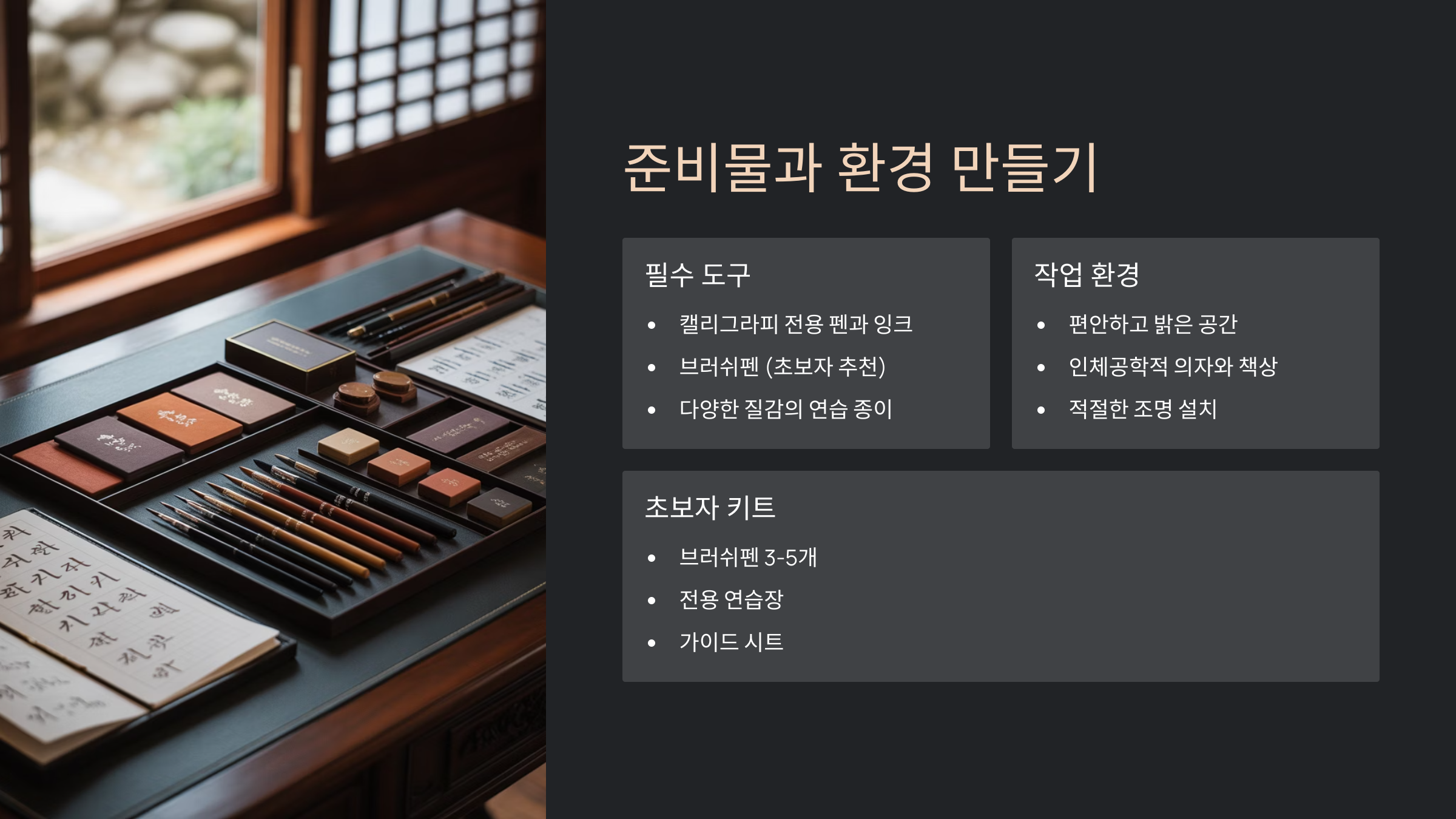 캘리그라피 준비물과 환경 만들기 캘리그라피를 시작하기 전에, 기본적인 도구들을 준비해야 해요. 물론 고급 도구가 아니어도 충분히 연습할 수 있답니다. 초보자에게는 너무 비싼 펜보다는 적당한 브러시펜이나 붓펜이 좋아요. 펜촉이 부드럽고 유연한 제품을 선택하면 손에 부담이 덜하고, 다양한 획을 연습하는 데 도움이 돼요.