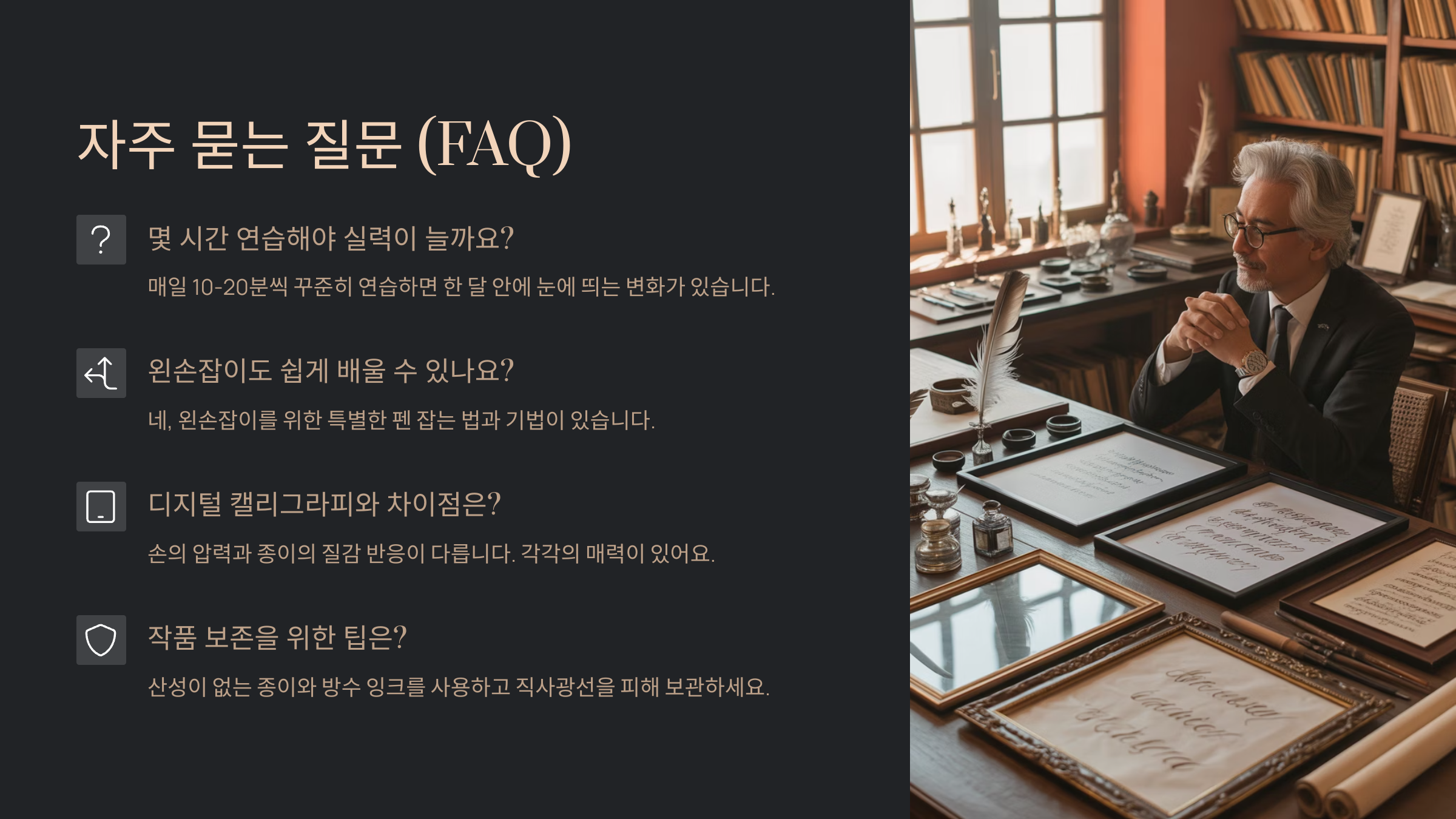 Q1. 캘리그라피는 글씨를 잘 써야 하나요?A1. 전혀 아니에요! 예쁜 글씨보다는 감정과 스타일을 담아내는 것이 더 중요하답니다. 연습을 통해 충분히 발전할 수 있어요.