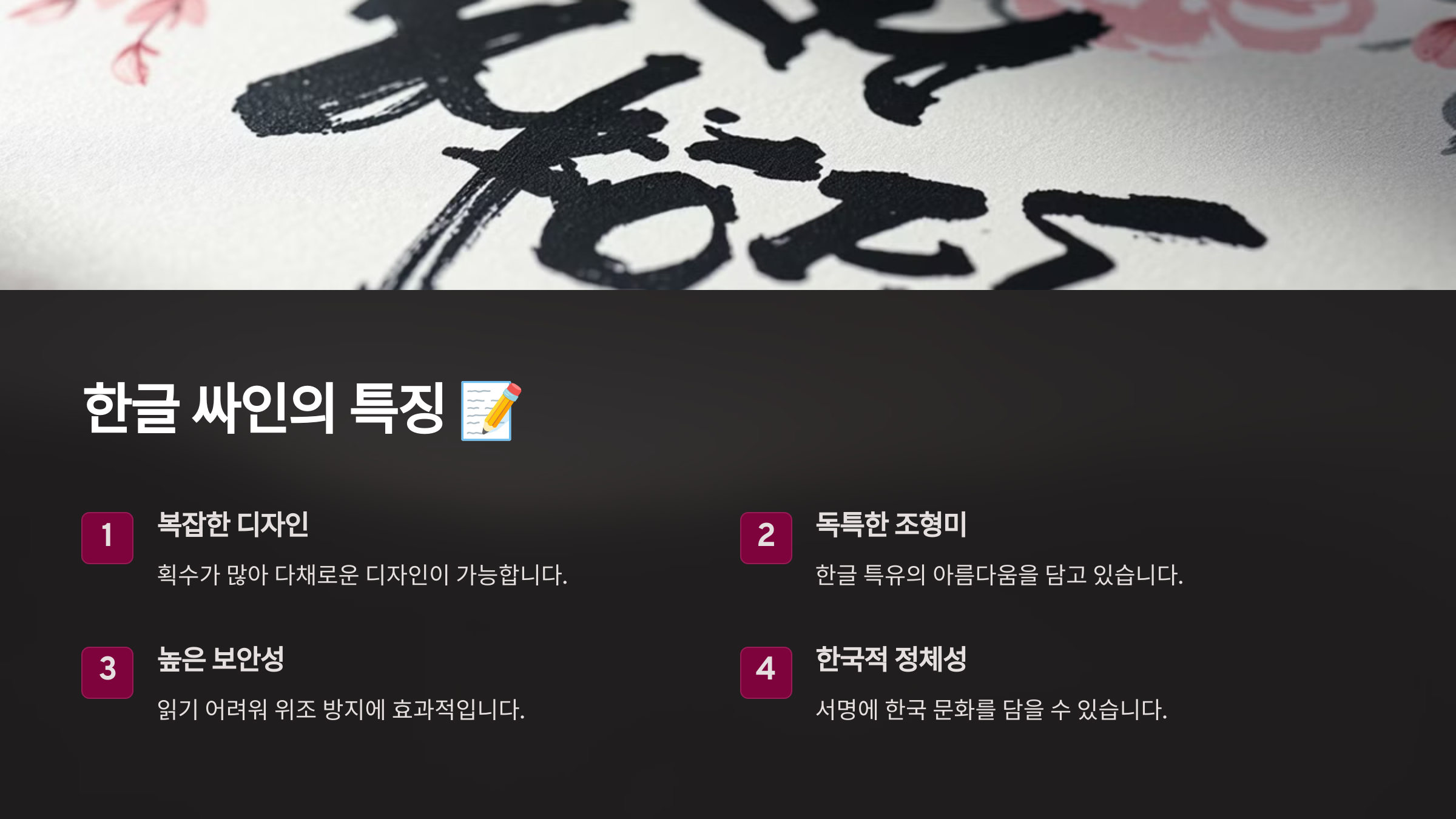 한글 싸인은 독창적이고 한국적인 멋을 담을 수 있다는 점이 매력적이에요. 특히, 한글은 자음과 모음의 조합이 자유로워 다양한 디자인이 가능해요. ✍