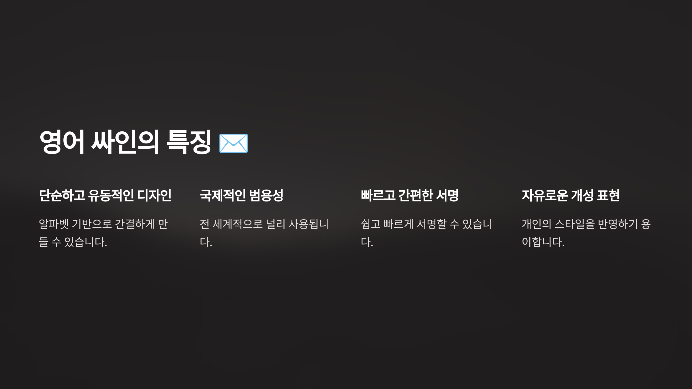 특징 설명 획의 조합 활용 자음과 모음을 변형하여 독창적인 디자인 가능 세로형 & 가로형 선택 가능 필기체 느낌을 가미할 수도 있음 강한 개성 표현 획을 변형하여 예술적인 스타일 연출 한글의 정체성 강조 전통적인 느낌과 현대적인 감각을 조화 이제 영어 싸인의 특징을 알아볼까요? ✉