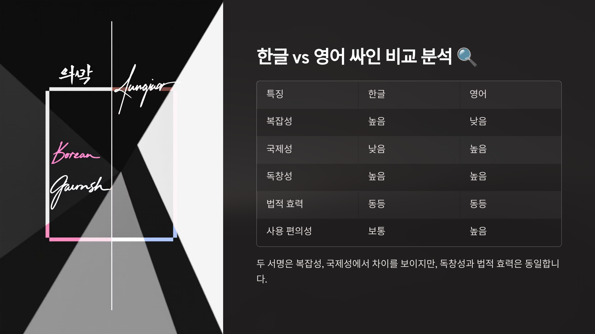 특징 설명 필기체 스타일 부드럽고 자연스럽게 이어지는 글자 이니셜 활용 간결한 서명으로 강한 인상 제공 빠른 싸인 가능 글자가 자연스럽게 연결되어 속도 향상 글로벌 활용성 국제적으로 활용하기 용이함 이제 한글 vs 영어 싸인 비교 분석을 해볼까요? 🔍