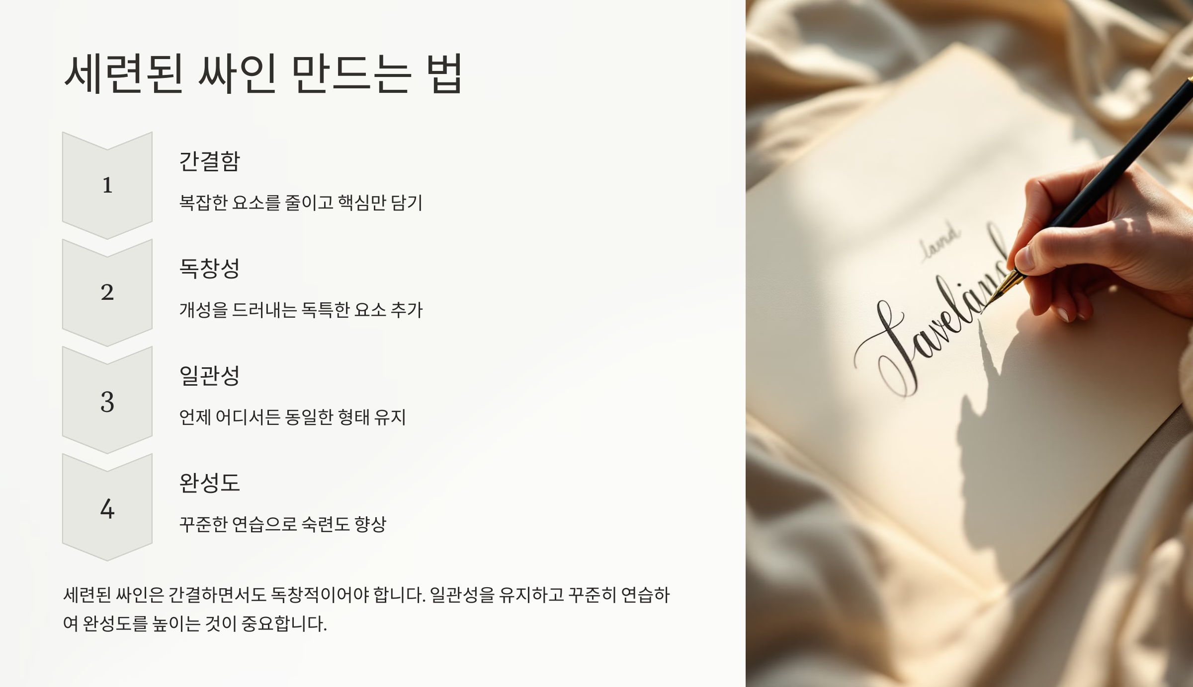 한자 싸인은 획이 많아 정교한 디자인이 가능하지만, 쓰는 데 시간이 걸릴 수 있어요. 반면 영어 싸인은 빠르고 유려하게 작성할 수 있어 실용적이에요. 하지만 영어 싸인은 필체에 따라 개성이 떨어질 수도 있어요.