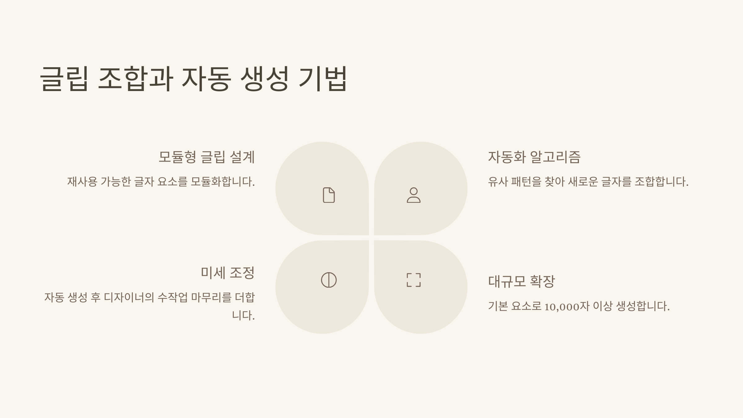 이런 자동화 방식은 특히 상업용 대규모 폰트를 제작할 때 필수예요. 기계적으로 반복되는 글자의 패턴을 파악해서 구조적으로 만들어놓으면, 유지보수도 쉬워지고 수정도 빠르게 반영할 수 있어요. 효율과 품질을 동시에 잡는 방식이에요!