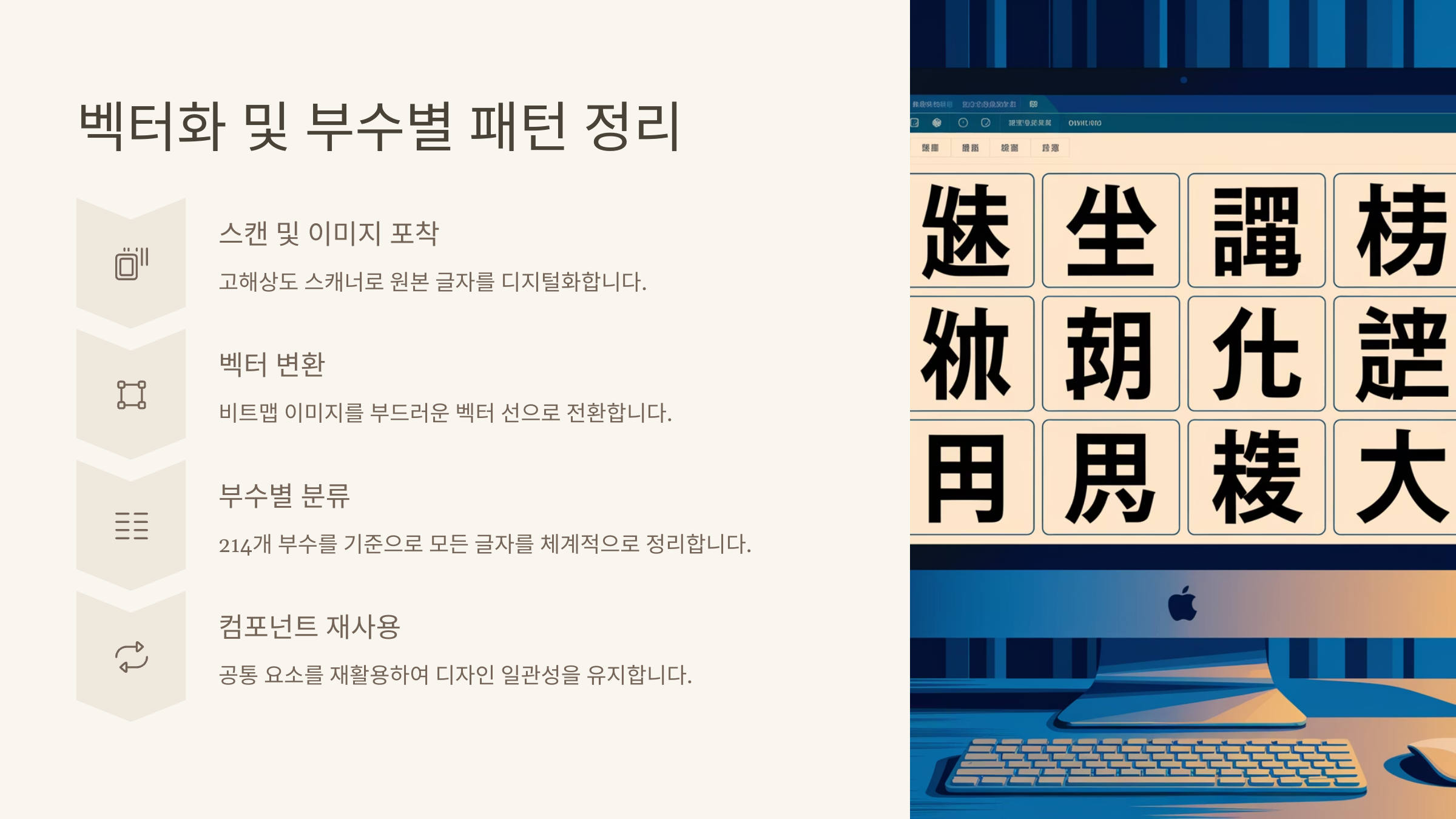 한자의 가장 큰 특징은 부수(部首)와 획의 조합이에요. 그래서 글자 전체를 하나씩 새로 그리기보단, 부수와 주요 구성 요소를 재활용할 수 있는 구조를 설계하는 게 핵심이에요. 이 부분이 자동화 가능한 구조 설계와 직결돼요.