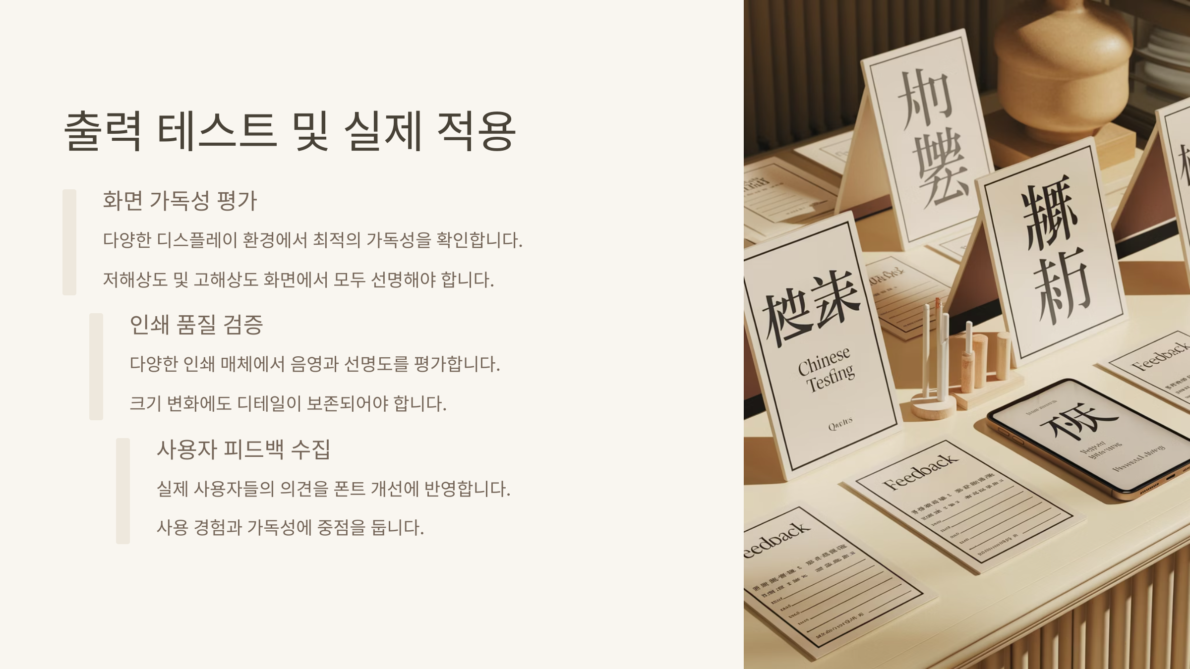 웹 테스트도 빼놓을 수 없어요. 폰트를 `.woff`나 `.woff2`로 변환해서 `@font-face`로 불러온 후 웹페이지에 적용해보세요. 한자가 깨지지 않고 잘 로딩되는지, 모바일 반응형에서도 이상 없는지까지 꼭 확인해야 해요. 📲