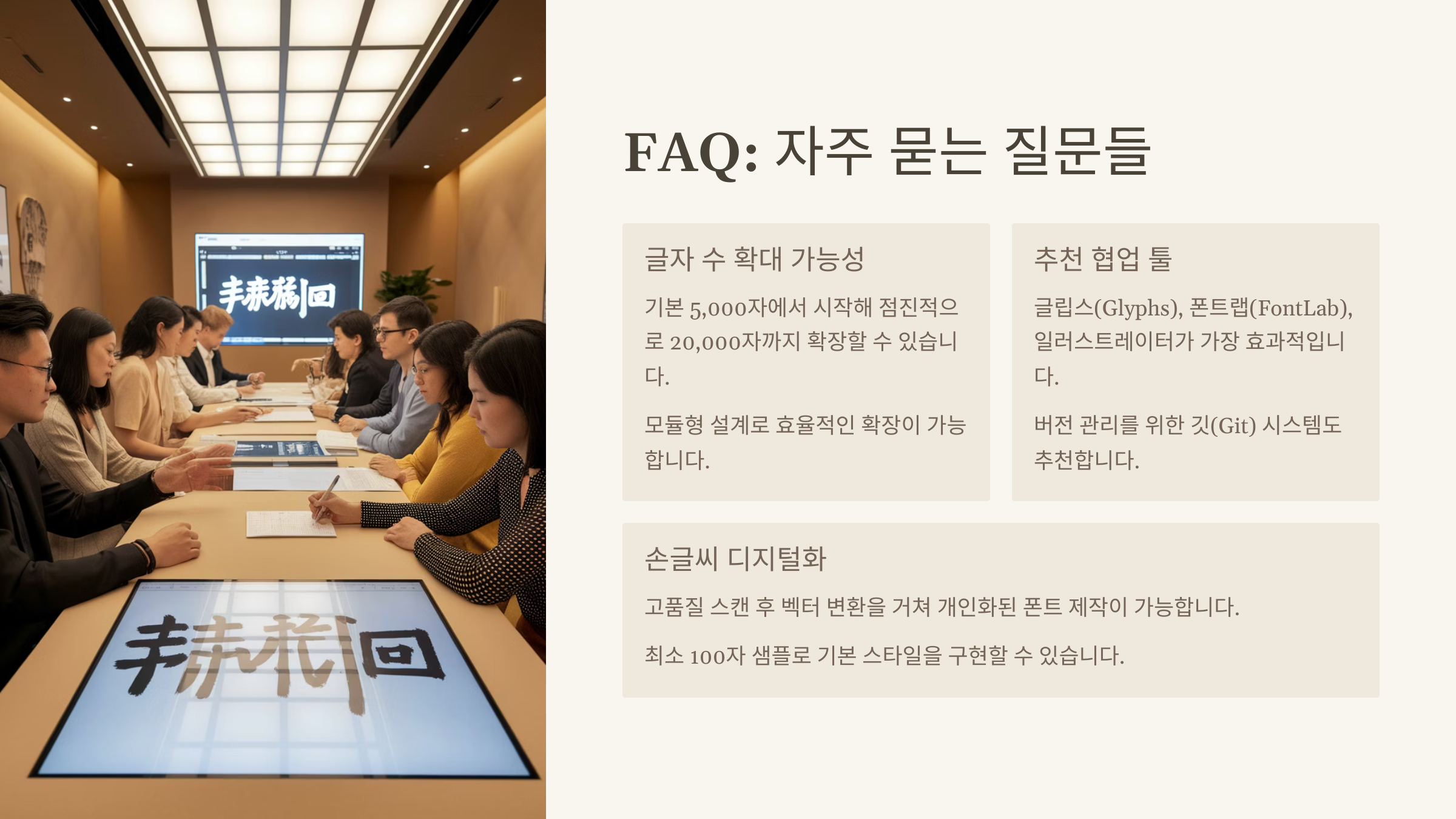 A1. 상용한자 1,800자를 기준으로 수작업 제작 시 3~6개월 이상 걸릴 수 있어요. 자동화와 조합 시스템을 활용하면 훨씬 단축 가능해요.