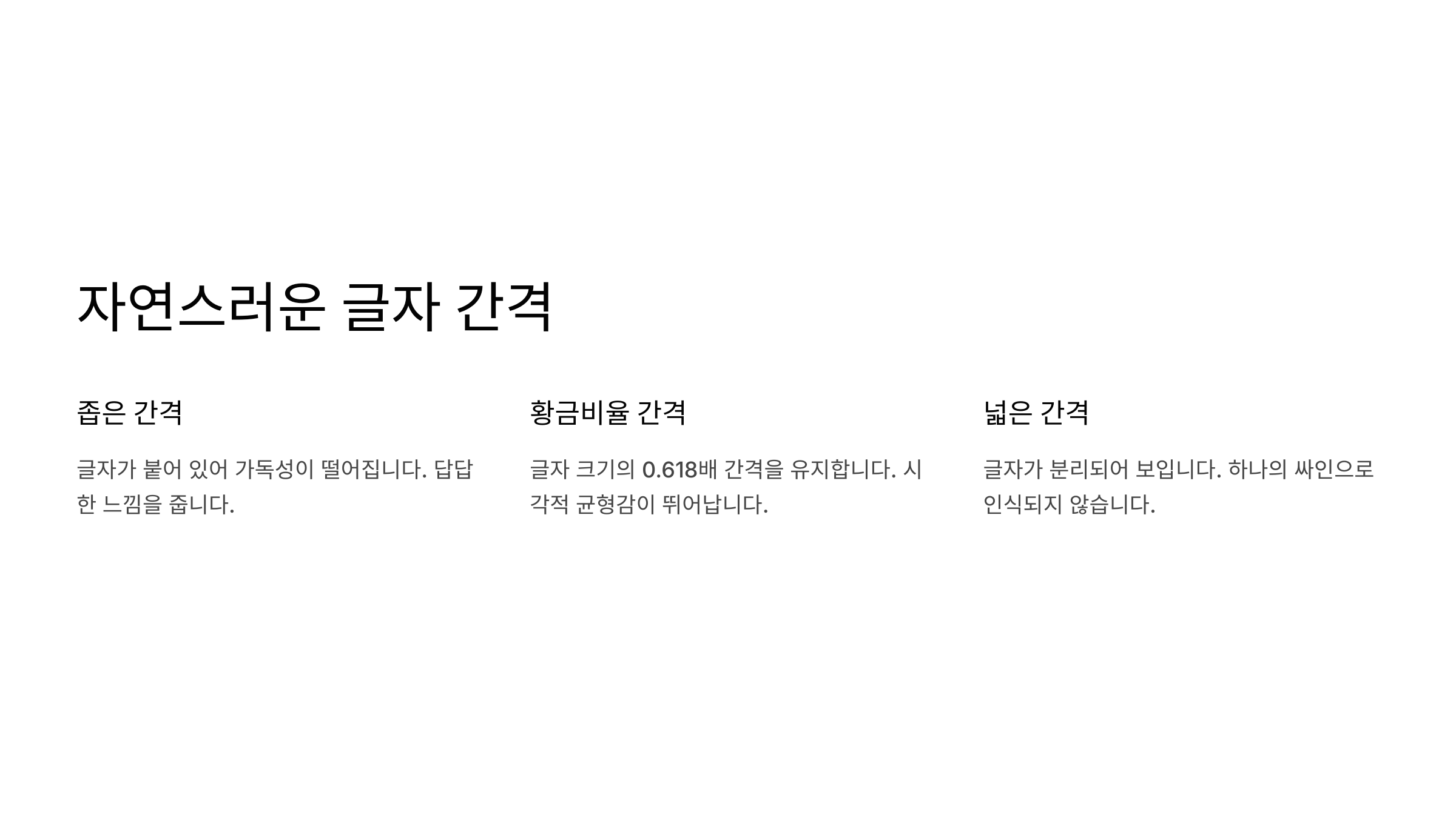 글자 간격 너무 붙거나 멀지 않도록 황금비율 간격 유지