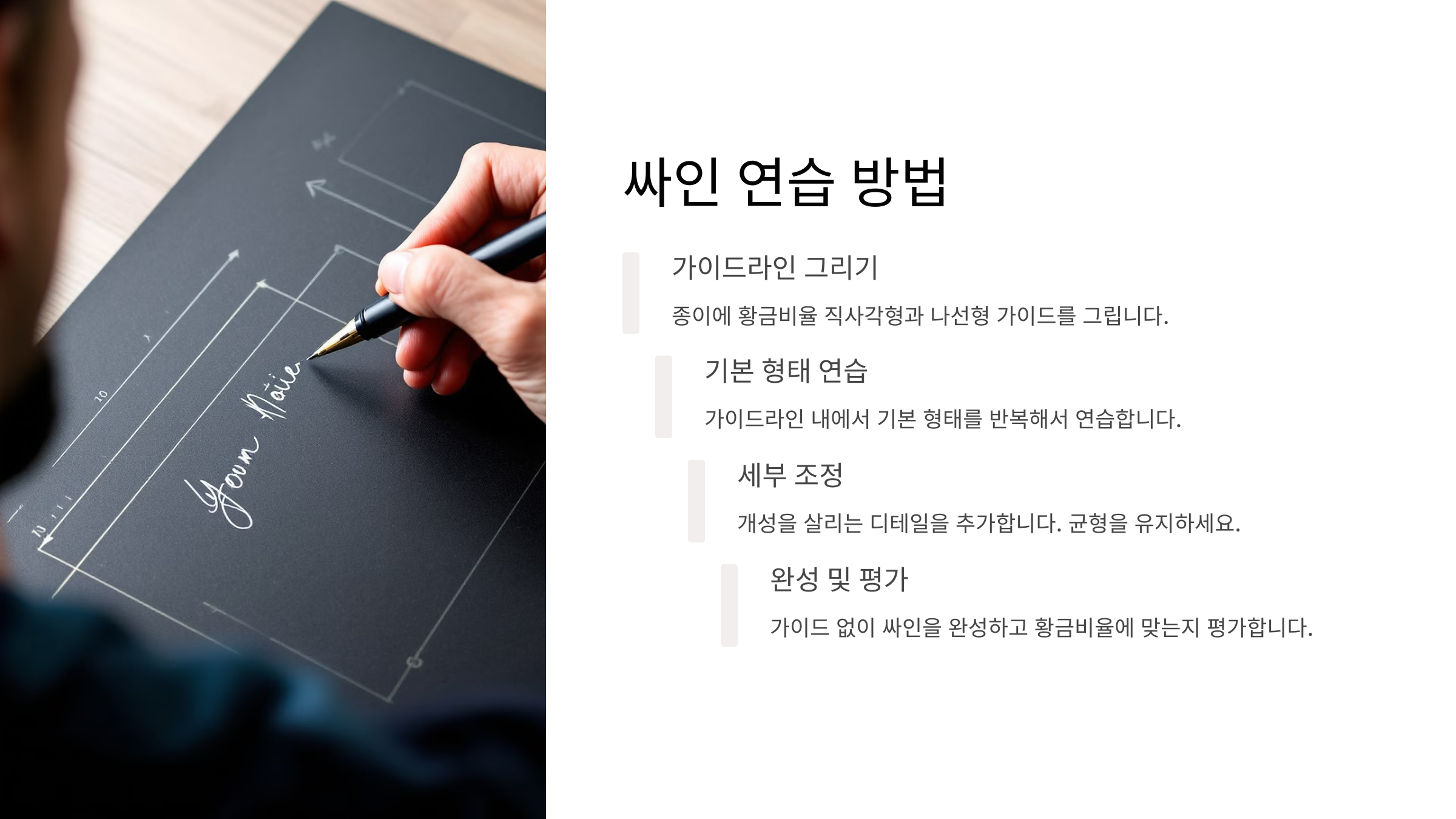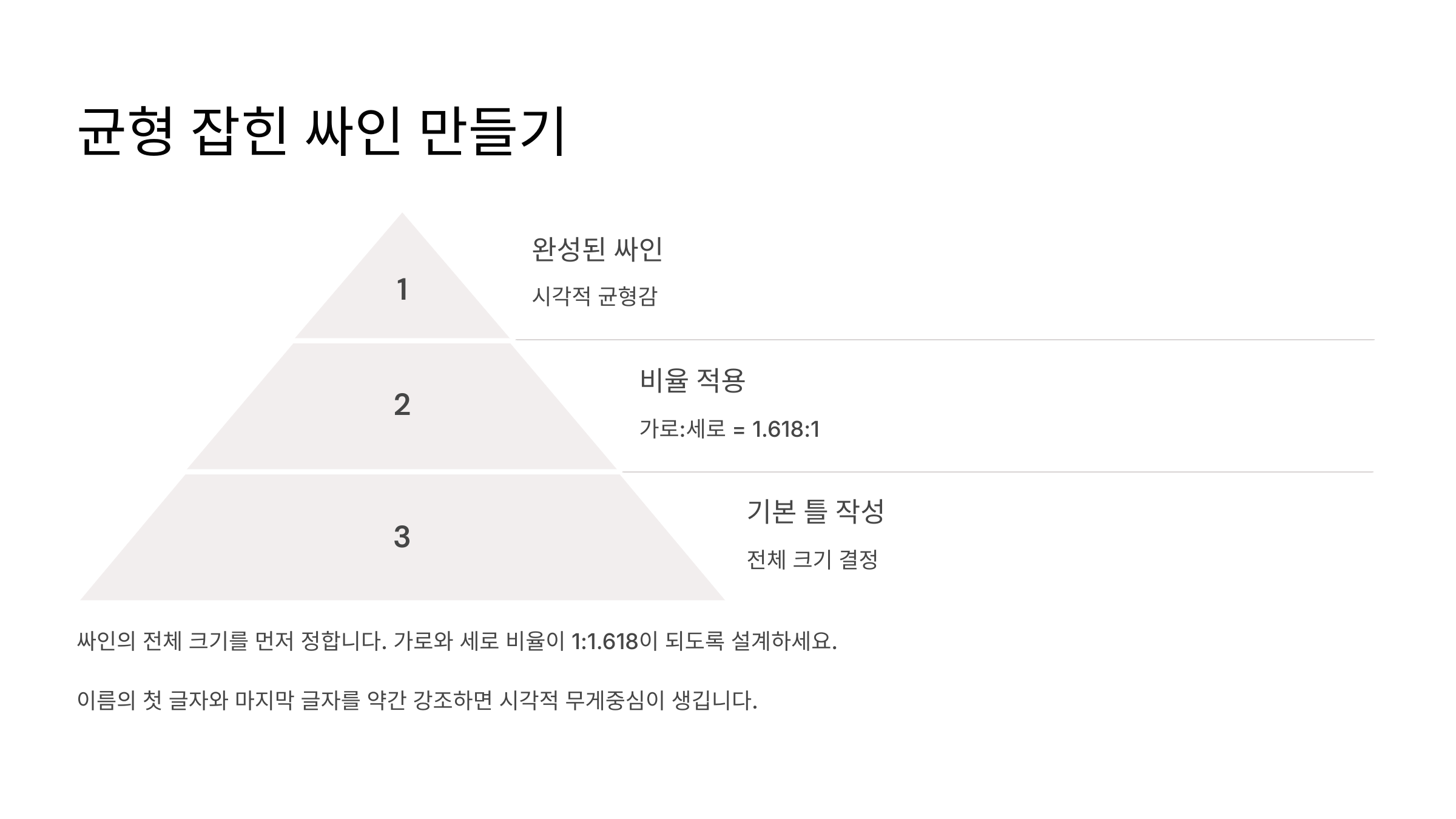 A1. 황금비율(1:1.618)을 적용하면 균형감 있고 자연스러운 싸인을 만들 수 있어요. 너무 크거나 작지 않고, 가독성이 좋아지는 효과도 있어요! 📏