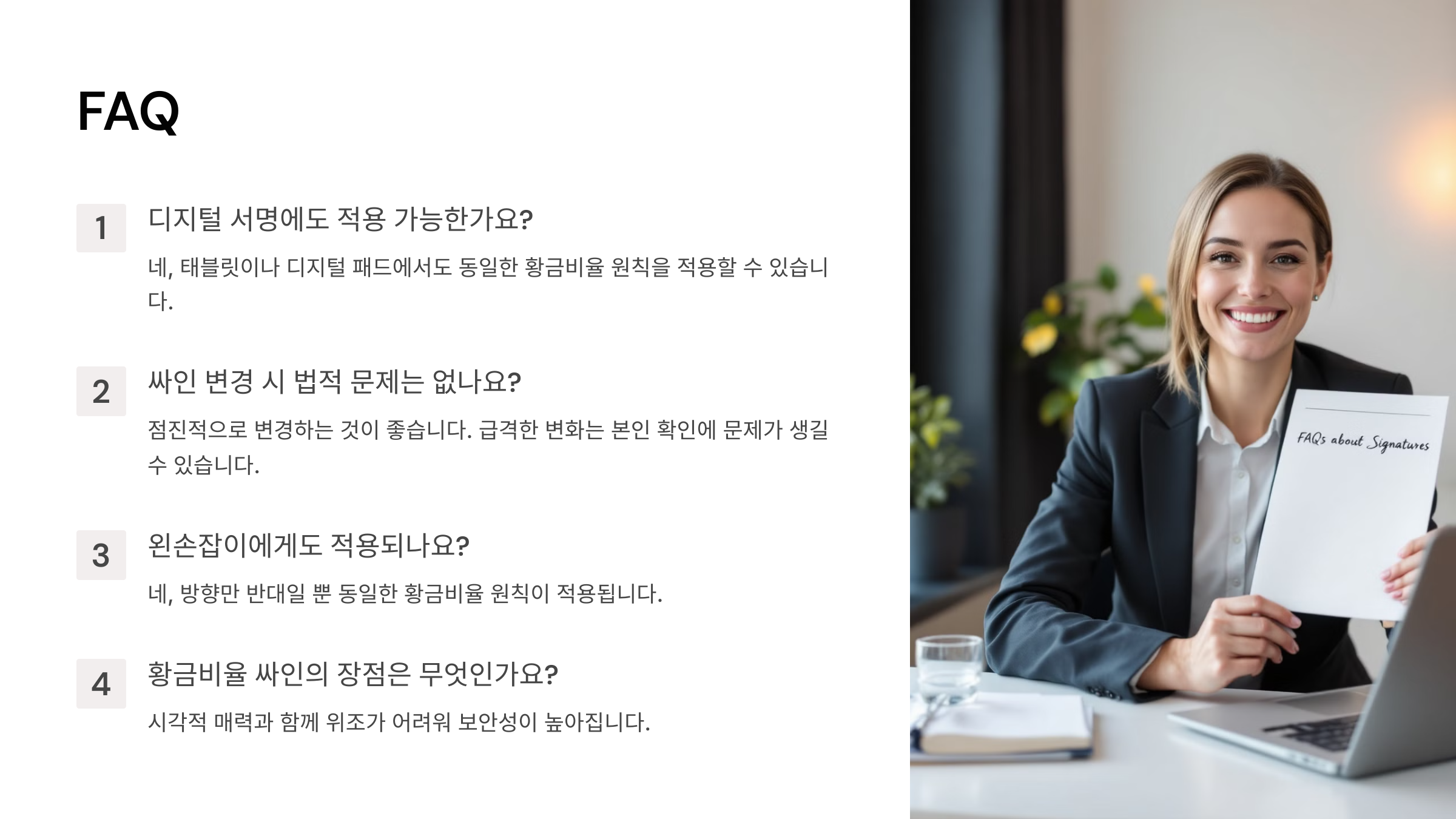 이제 황금비율을 적용해 나만의 멋진 싸인을 만들어 볼 차례예요! 마지막으로, 싸인 디자인과 관련된 자주 묻는 질문(FAQ)을 정리해 볼게요. 📢