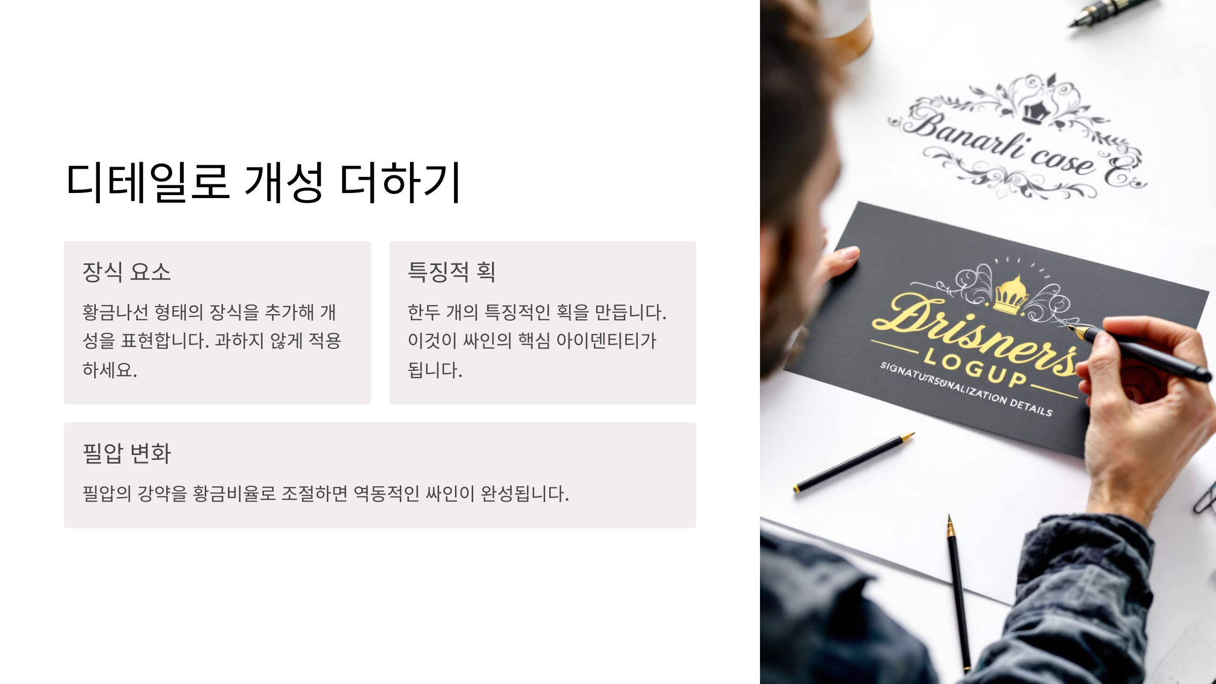너무 각진 싸인은 딱딱한 느낌을 줄 수 있고, 반대로 흐름이 없는 싸인은 연결감이 부족해 보일 수 있어요. 그래서 적절한 곡선과 직선을 조합하는 것이 핵심! ✨