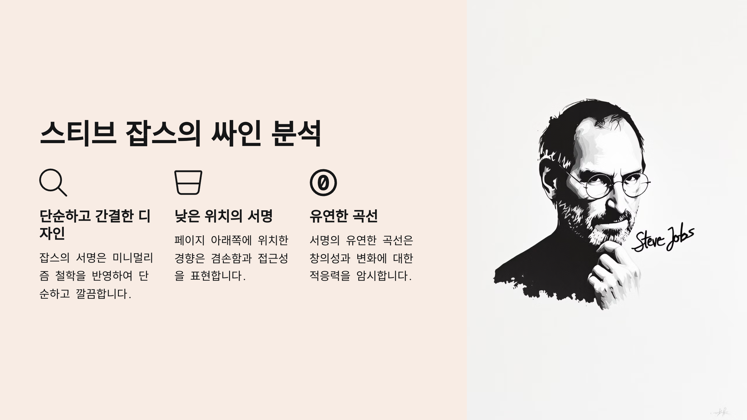 잡스의 싸인은 단순하지만 강한 개성을 가진 필기체로 이루어져 있으며, 특히 획이 일정하고 명확한 글씨체가 특징이에요. 이는 그가 불필요한 것을 제거하고 본질만 남기는 사고방식을 가지고 있었다는 걸 보여줘요. ✍️