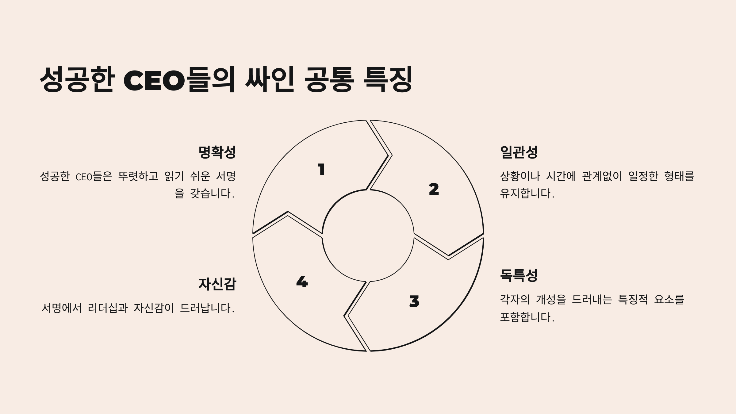 A4. 명확성, 개성, 속도감, 신뢰감이 가장 중요한 요소예요. CEO들은 자신들의 철학을 싸인에 반영하죠. ✍️