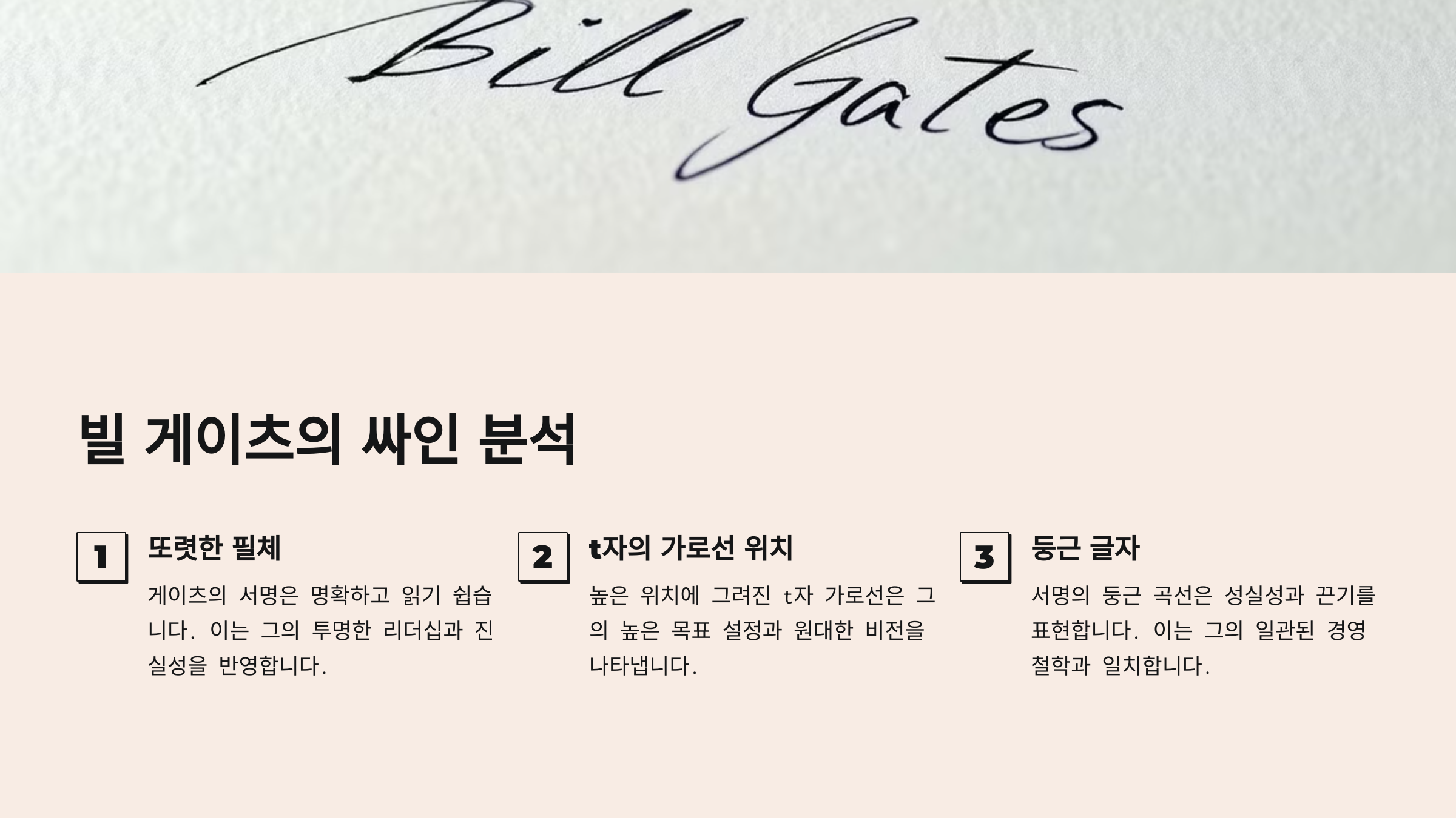 싸인 스타일 특징 대표 CEO 깔끔하고 정갈한 싸인 가독성이 뛰어나고 신뢰감을 줌 빌 게이츠 빠르고 다이나믹한 싸인 창의적이고 도전적인 이미지 일론 머스크 심플한 미니멀 스타일 최소한의 획으로 효율성을 강조 스티브 잡스 곡선적이고 부드러운 싸인 유연성과 협업을 중시하는 경영 스타일 제프 베이조스 이제 CEO들의 싸인이 어떤 의미를 가지는지 알았어요! 그럼 먼저, 빌 게이츠의 싸인을 분석해 볼까요? 🔍
